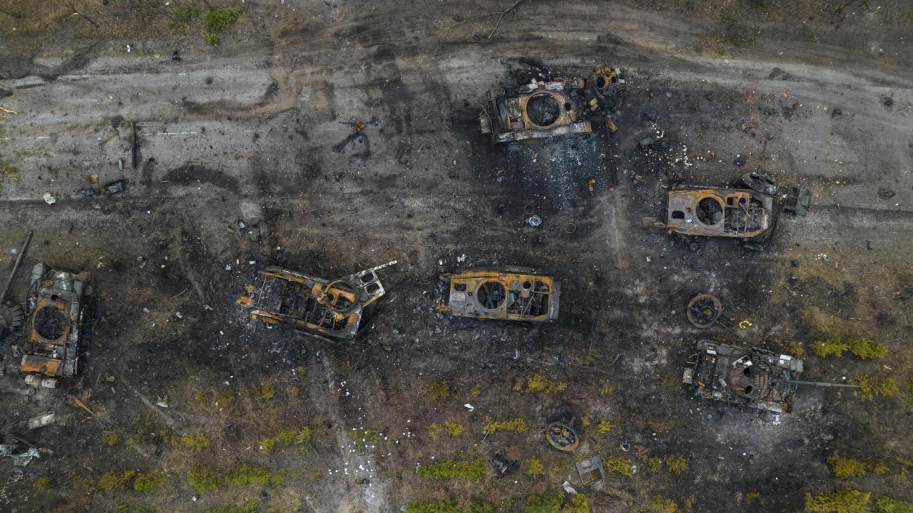 Bir kadın, Kiev`in eteklerinde Buça`da yıkılan Rus askeri araçlarının durduğu enkaz dolu bir sokakta geziniyor.
