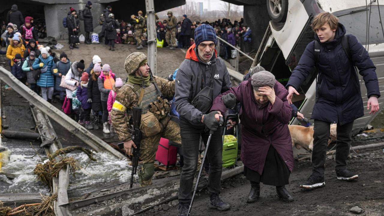 Ukrayna`nın Irpin kasabasından kaçarken Rus ordusunun ilerlemesini yavaşlatmak için Ukrayna birlikleri tarafından tahrip edilen bir köprünün altındaki doğaçlama bir yoldan yaşlı kadının Irpin Nehri`ni geçmesine yardım ediliyor.