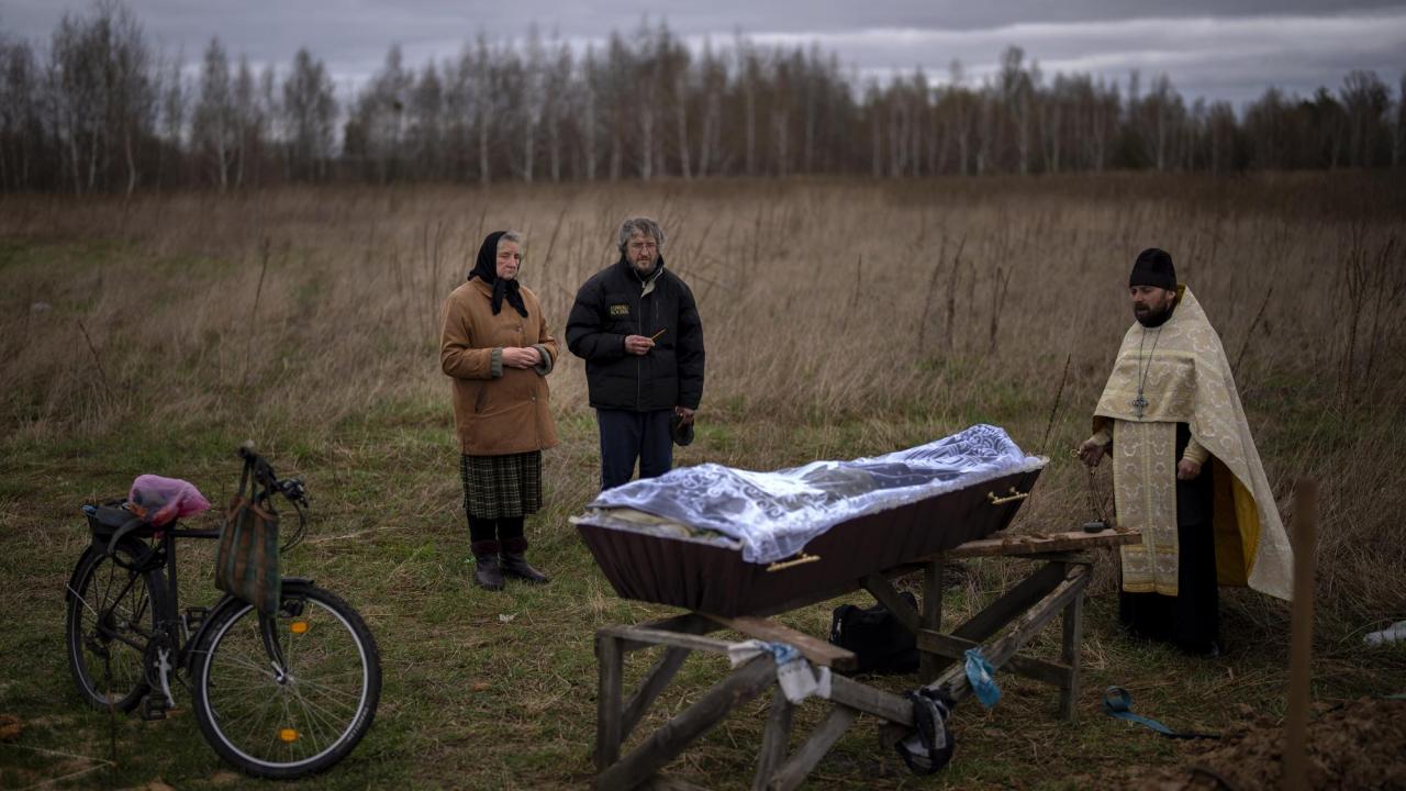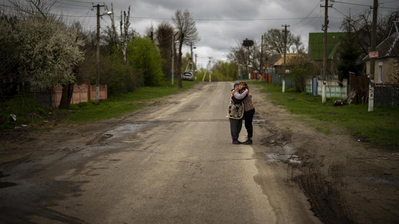 Ukrayna`nın Bucha yakınlarındaki Ozera köyünde Tetyana Boikiv`in (sağda) kocası Mykola Moroz için düzenlenen cenaze töreninden sonra komşusu Svitlana Pryimachenko`ya sarılıyor.