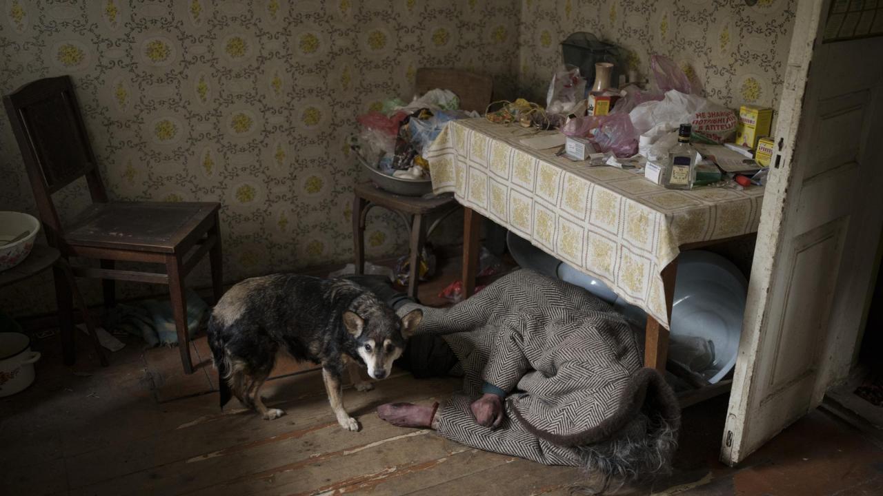 Kiev`in eteklerinde Bucha`da bir evde öldürülen yaşlı bir kadının cesedinin yanında bir köpek duruyor.