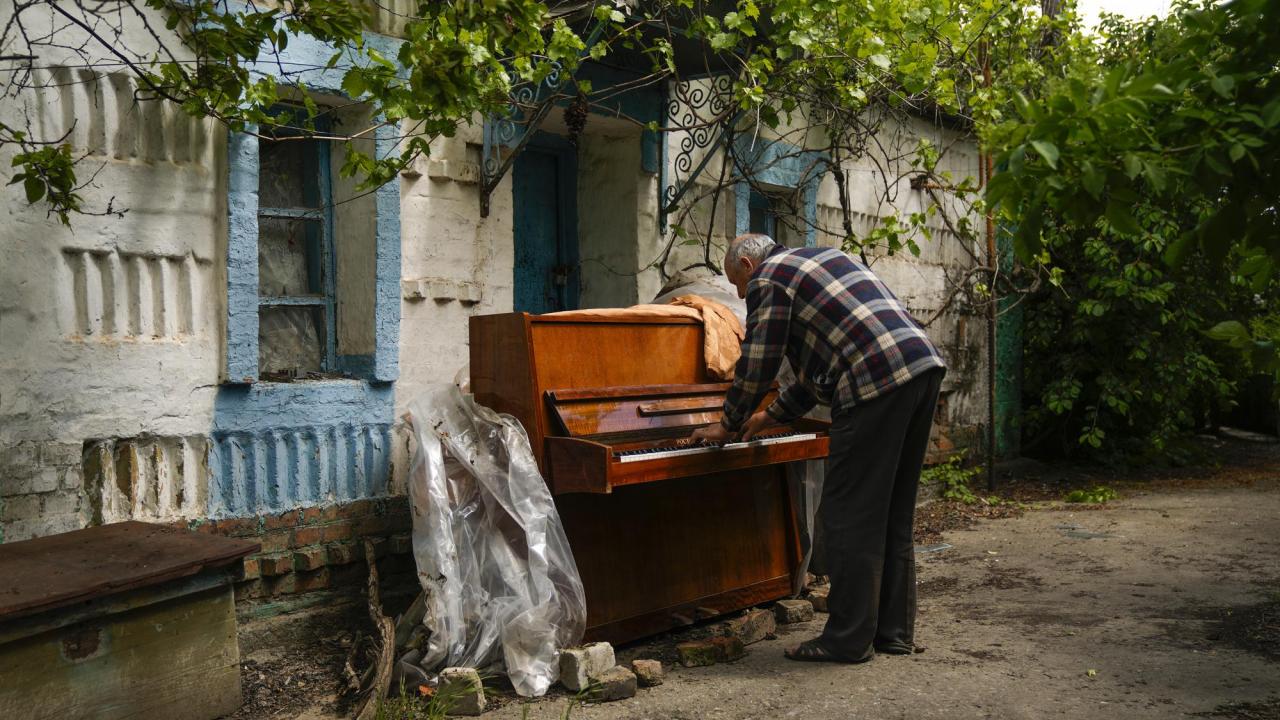 Ukrayna`da bir Rus bombalamasından sonra muhtemelen hasar gören bir evin önünde piyano çalan bir adam.