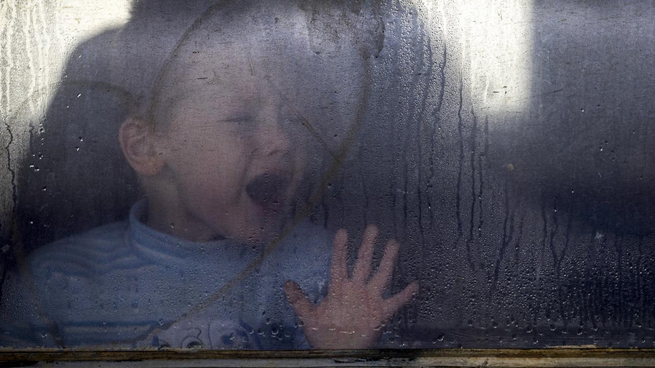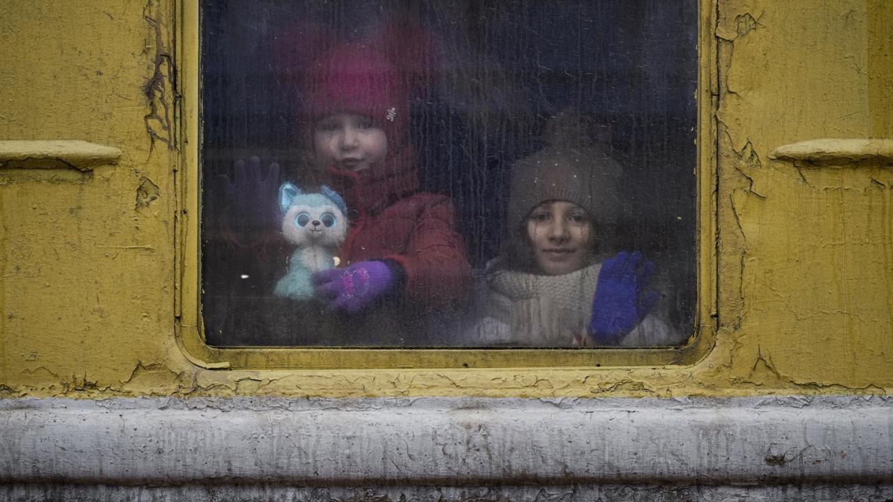 Çocuklar Lviv`e giden ısıtmasız bir trenin penceresinden dışarı bakıyor.