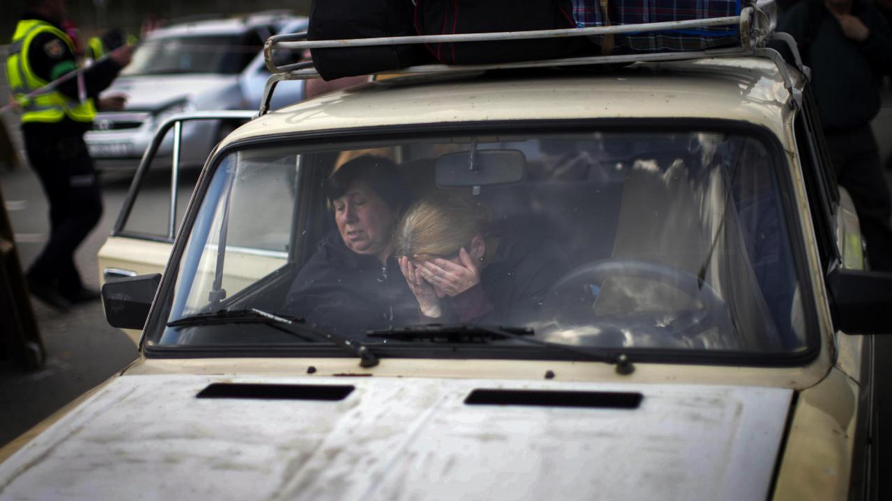 İnsanlar, Zaporizhzhia`daki yerinden edilmiş insanlar, kabul merkezinde işlem görmek için bir arabada bekliyor.