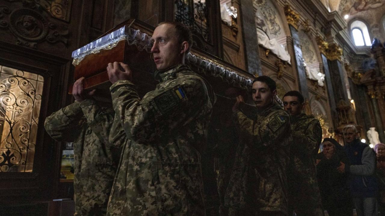 Çatışmada öldürülen 40 yaşındaki Kıdemli Teğmen Oliynyk Dmytro`nun annesi cenaze töreninde tabutunun arkasında yürürken yas tutuyor.