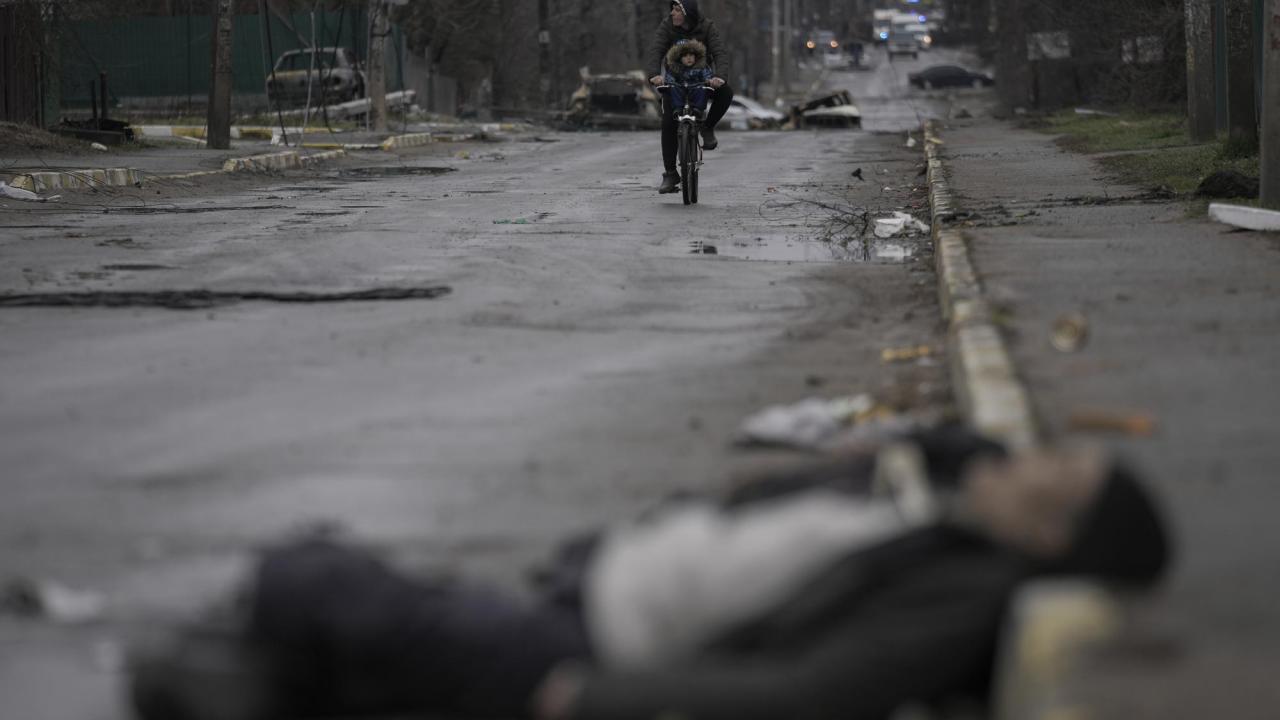 Ukrayna`nın eski Rus işgali altındaki Kiev banliyösü Buça`da bir adam ve çocuk, sivil cesetlerinin bulunduğu bir sokakta bisiklet sürüyor.