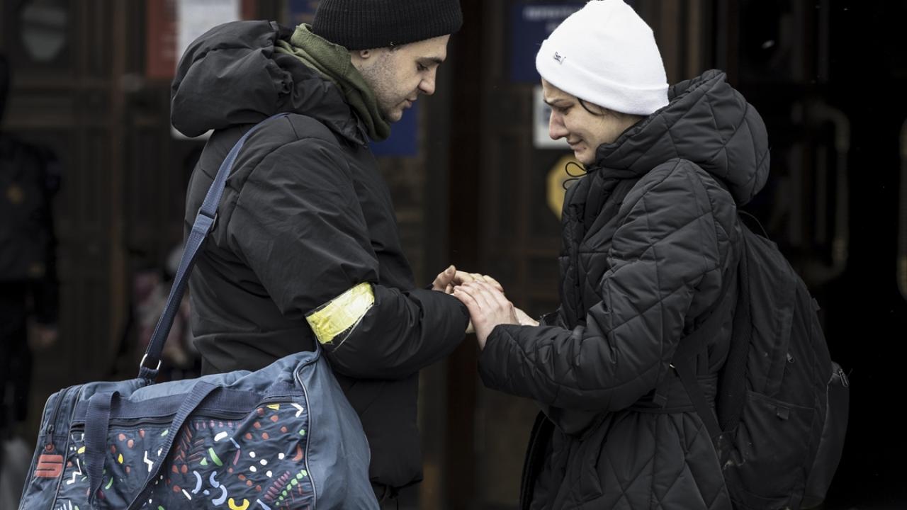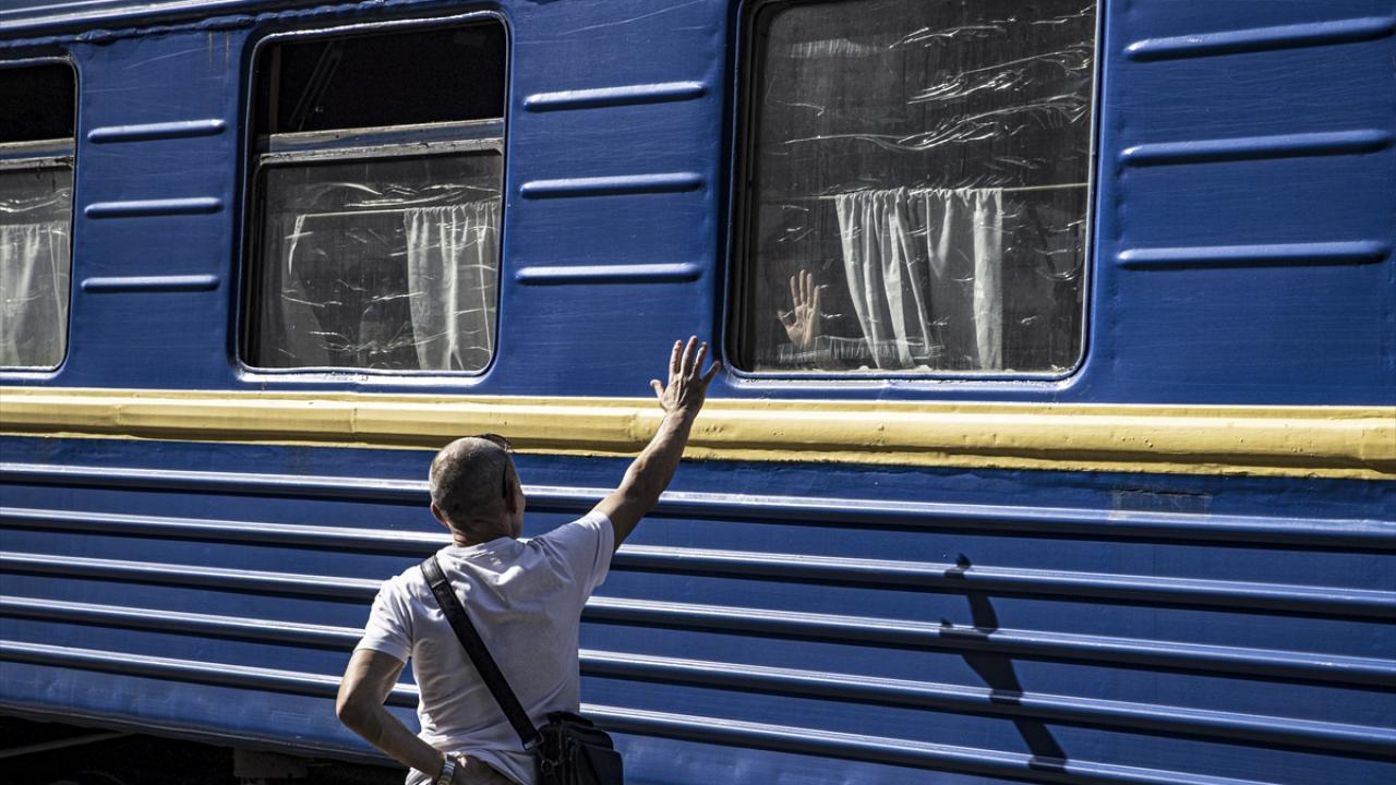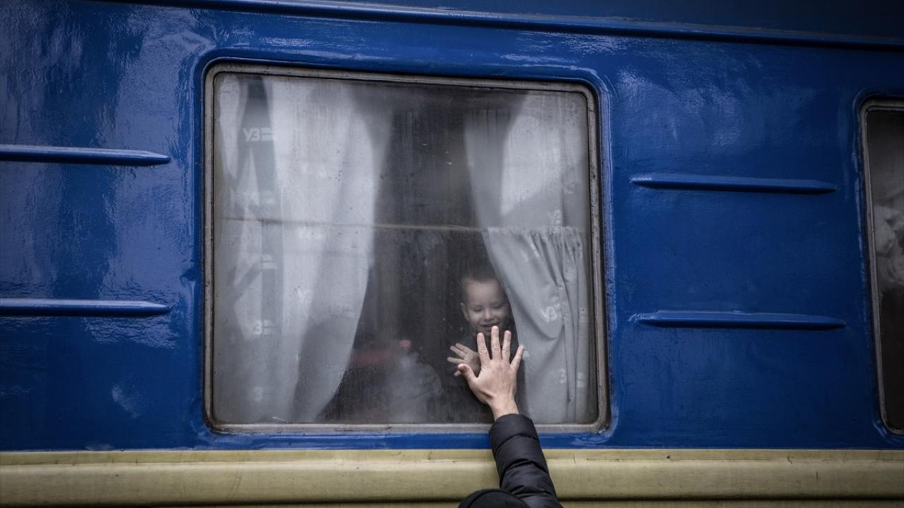 Rusya`nın Ukrayna`nın Dnipro şehrinde devam eden saldırılarından dolayı siviller, ülkedeki farklı bölgelere tahliye edilmişti. 2 Mart 2022`de Lviv`e hareket eden trendeki bir çocuk, yakınlarıyla vedalaşmıştı. (Arşiv)