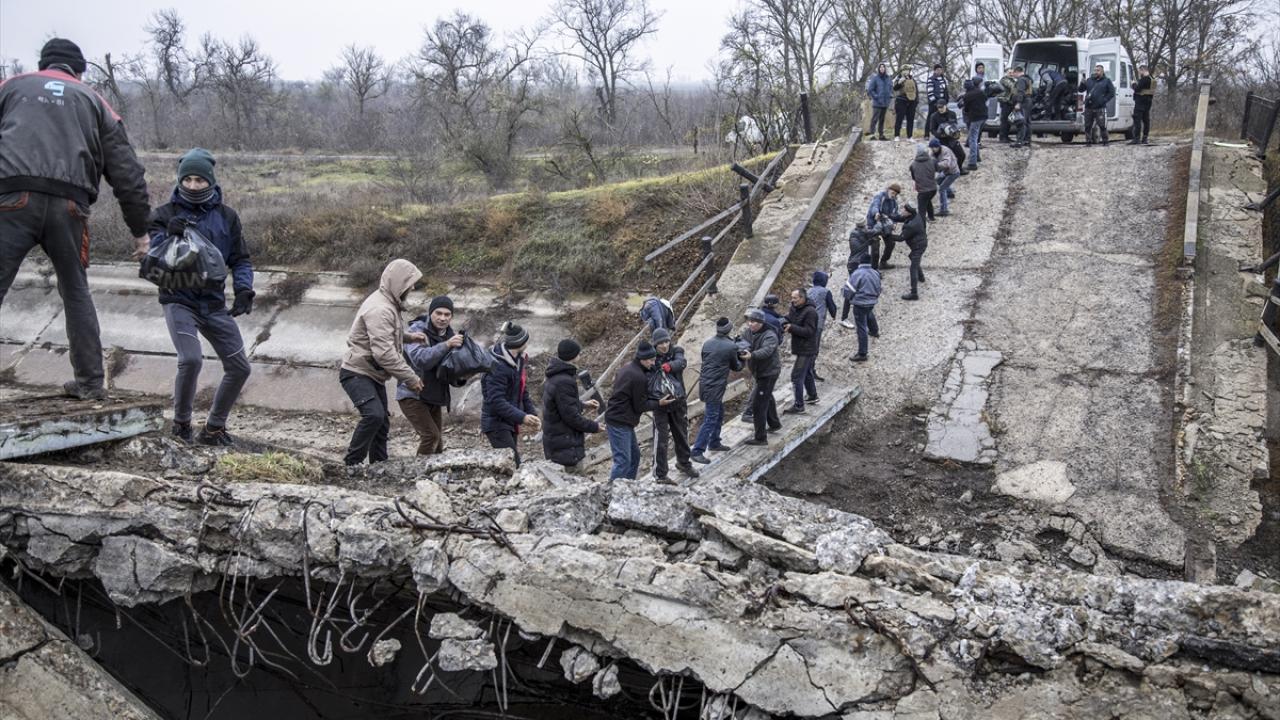 17 Kasım 2022`de tekrar Ukrayna ordusunun kontrolüne geçen Herson kenti ve çevresinde insani yardım dağıtılmıştı. Mikolayiv Oblastı`ndaki Novopetrivka`da toplanan Ukraynalılar, dağıtılan yardımı çökmüş bir köprü üzerinde el birliği ile taşımıştı. (Arşiv)