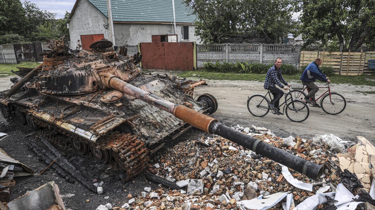 5 Haziran 2022`de Ukrayna`nın başkenti Kiev`e yaklaşık 60 kilometre uzaklıkta bulunan ve martın sonuna kadar yoğun çatışmalara sahne olan Zahaltsi köyünde, yolda kullanılamaz hale gelen bir tank dikkati çekmişti. (Arşiv)