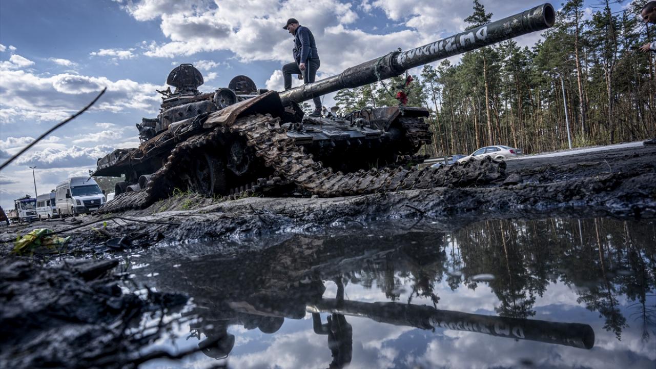 2 Mayıs 2022`de Rus güçlerinin geri çekildiği başkent Kiev’in Makariv bölgesinde, harabeye dönen bir tank. (Arşiv)
