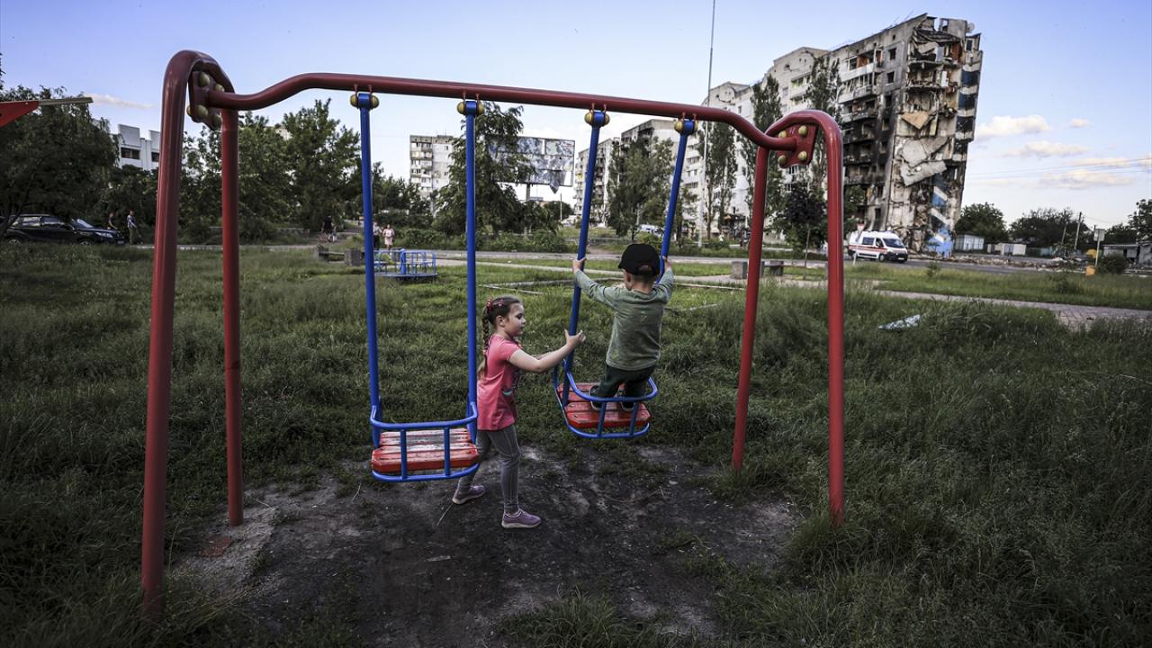 3 Haziran 2022`de Borodyanka`da gittiği kreş savaş nedeniyle kapalı olan 6 yaşındaki Milana Bevza, arkadaşlarıyla oyun parkında vakit geçirmişti. (Arşiv)