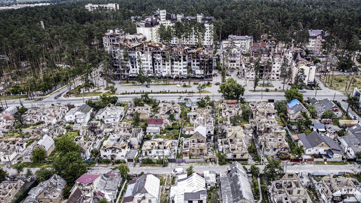 23 Haziran 2022`de başkent Kiev yakınlarındaki İrpin`in Gostomel Caddesi çevresindeki yıkım havadan görüntülenmişti. (Arşiv)