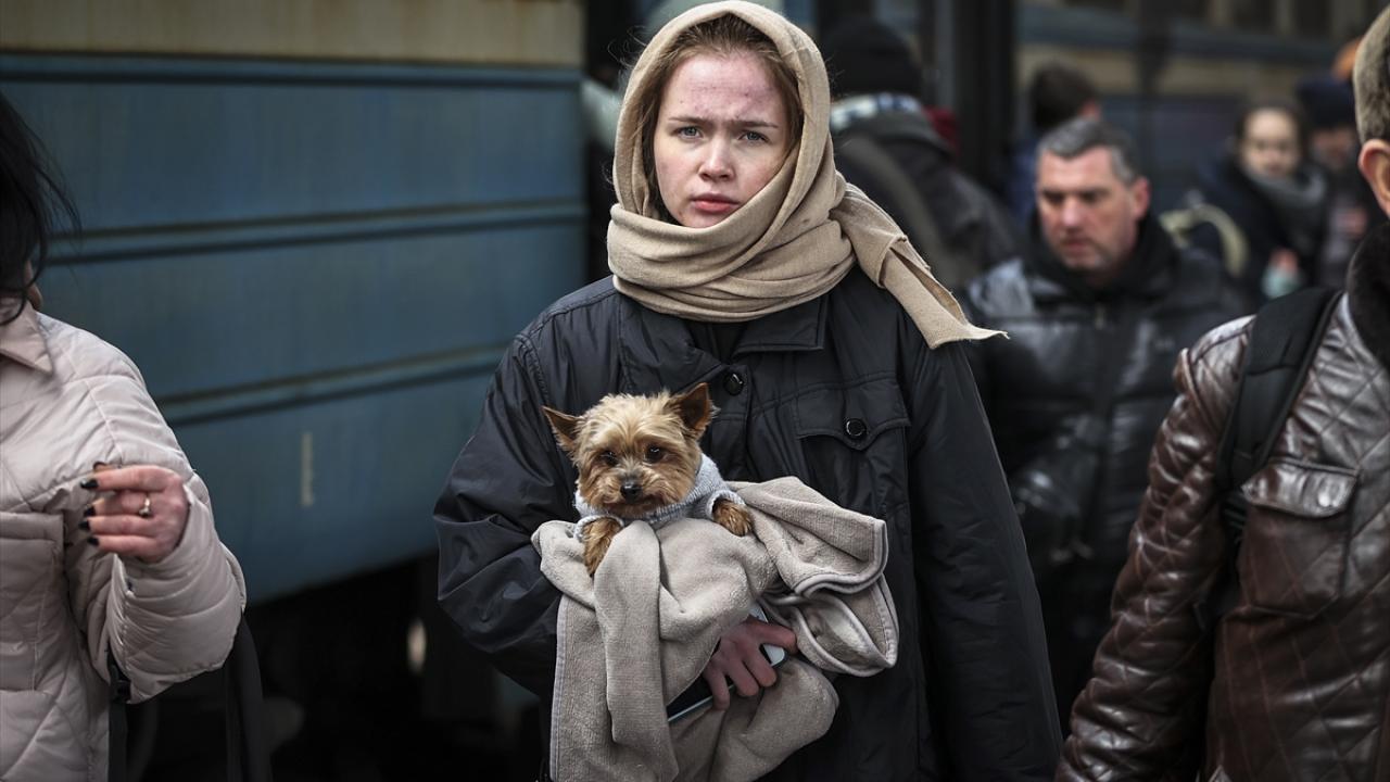 7 Mart 2022`de Rusya`nın saldırısı altındaki Ukrayna`nın başkenti Kiev`i terk etmek zorunda kalan siviller, yanlarında evcil hayvanlarını da götürmüştü. (Arşiv)