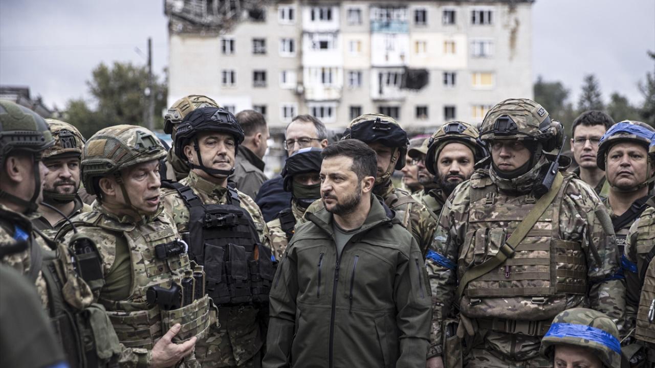 14 Eylül 2022`de Ukrayna Devlet Başkanı Volodimir Zelenskiy (ortada), Rus güçlerinden geri alınan Harkiv bölgesine bağlı İzyum şehrine gelerek İzyum Şehir Konseyi binası önünde Ukrayna bayrağının göndere çekilme törenine katılmıştı. (Arşiv)