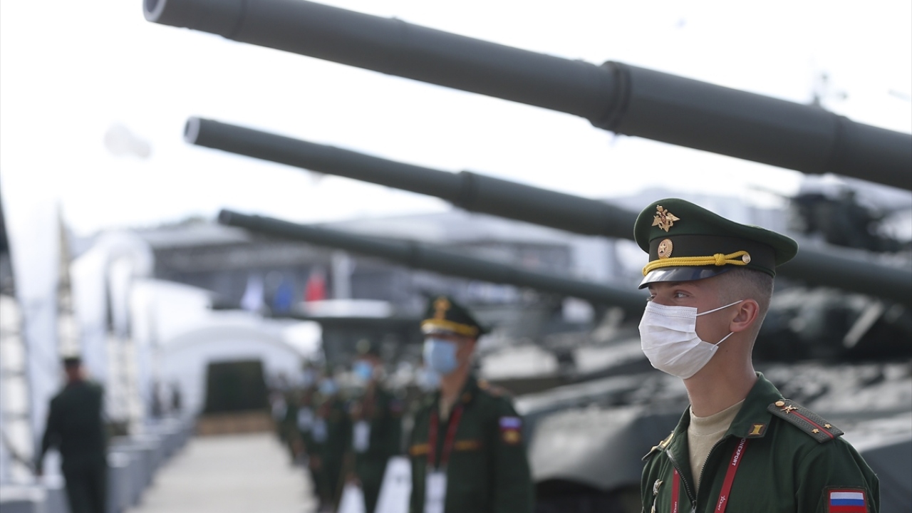 Koronavirüse karşı tedbirlerin alındığı fuarda, Rusya Savunma Sanayii`ne ait ağır ve hafif silahlar yer aldı.