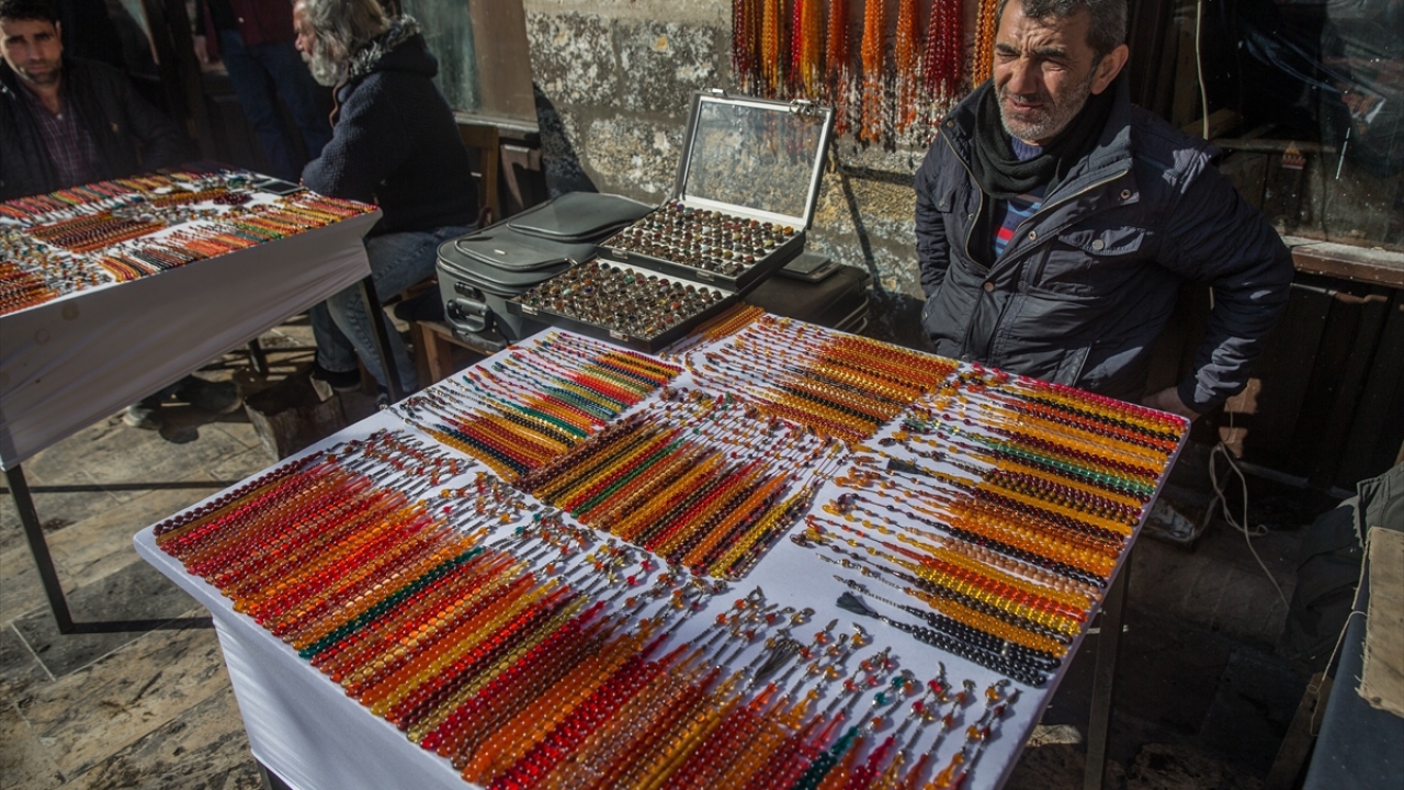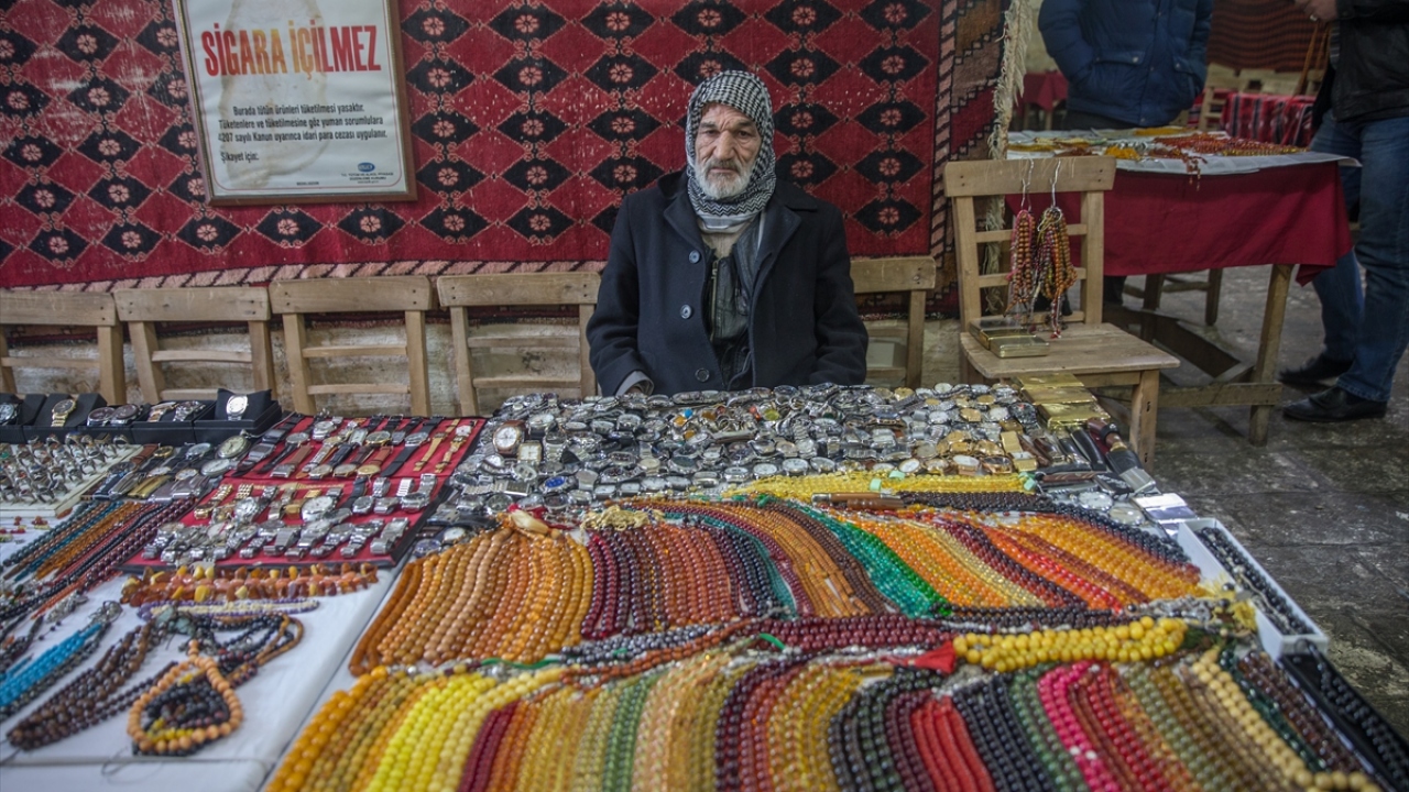 Oltu taşından kehribara, Osmanlı dönemine ait tespihlerden farklı çeşitlere kadar çok sayıda ürünün sergilendiği tezgahlarda her bütçeye uygun tespih bulunabiliyor.