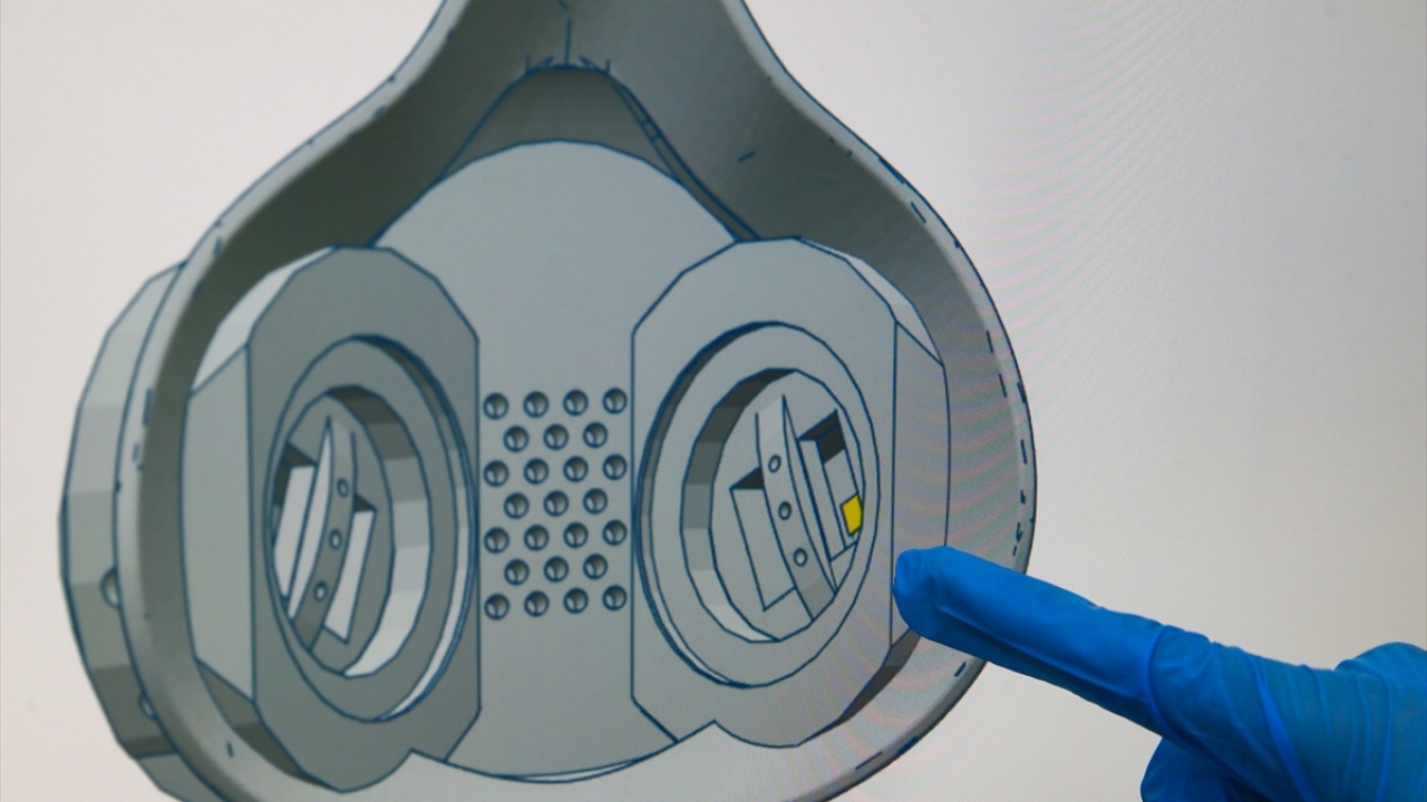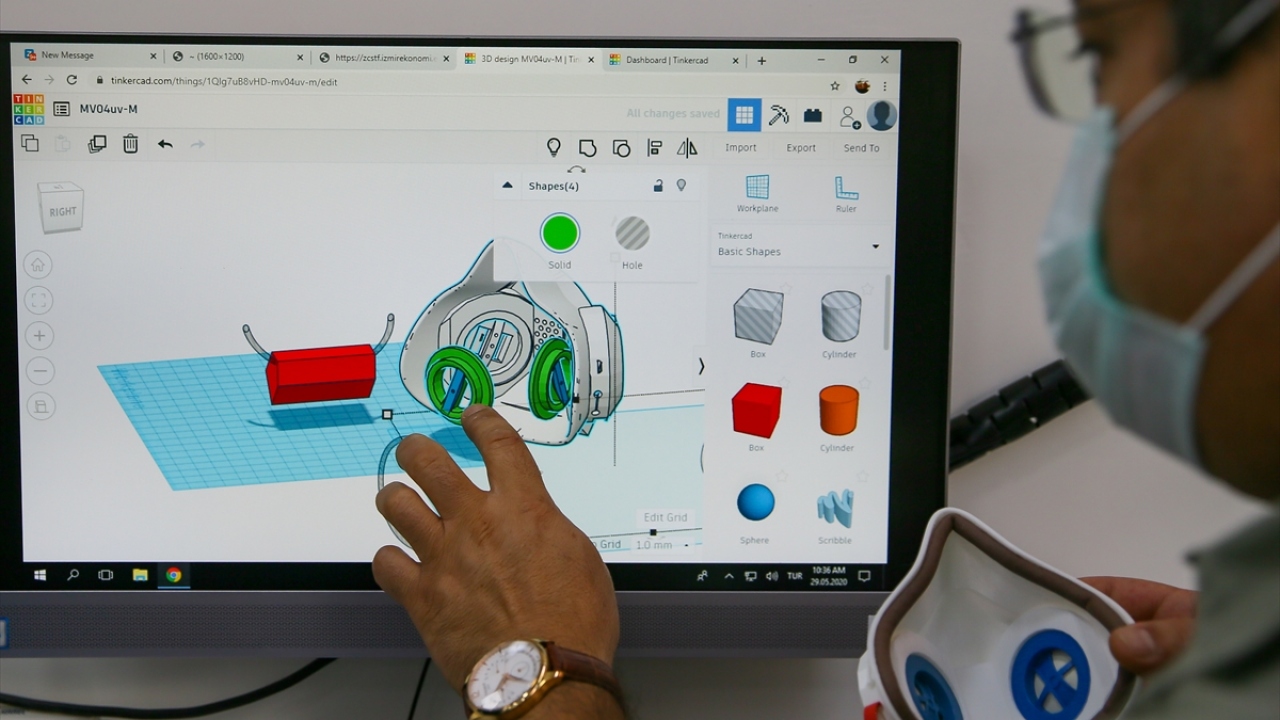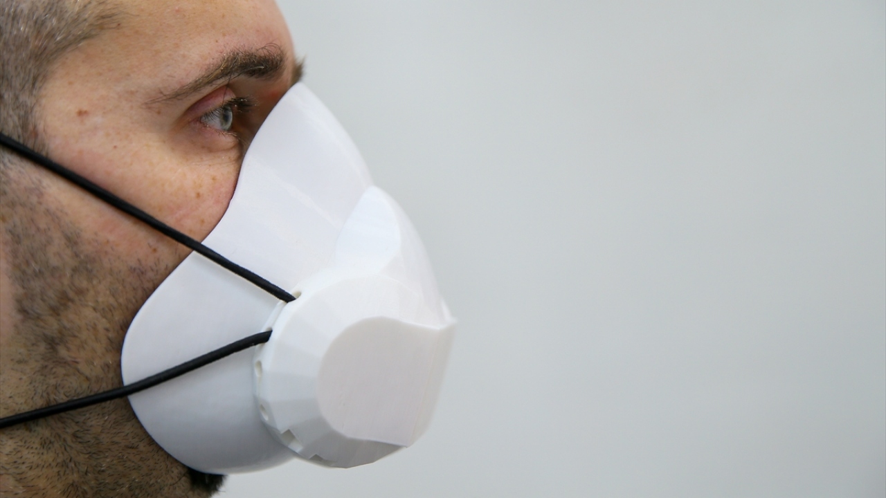 "Pla filament" maddesinden yararlanılarak geliştirilen 80 gram ağırlığındaki maske, 3D yazıcıyla üretilirken çift hava kanalına yerleştirilen mercimekten biraz büyük ultraviyole ledler sayesinde filtrelerin sterilizasyonu sağlanıyor.