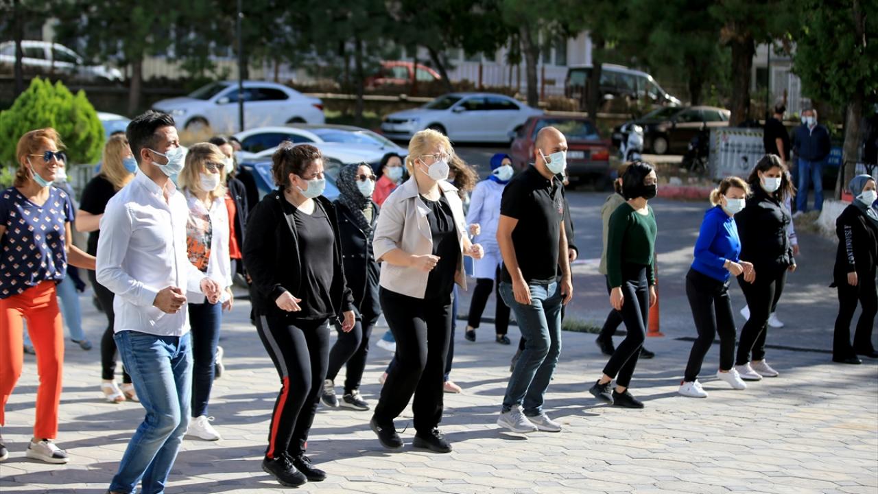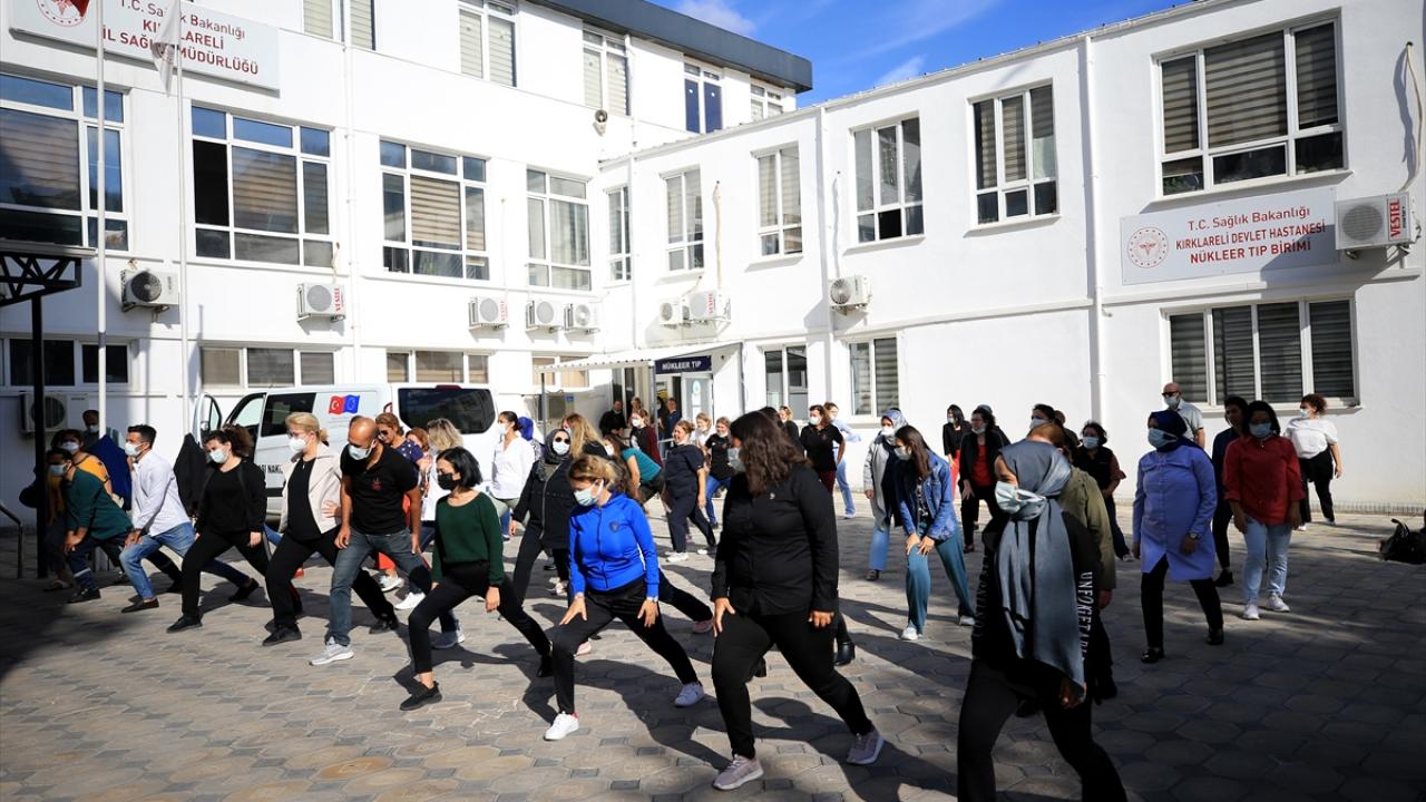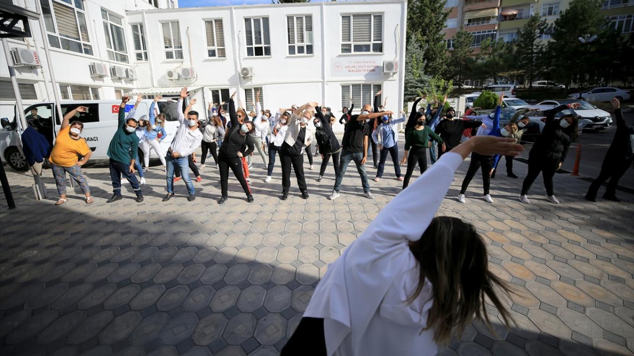 Sağlık çalışanları, fizyoterapist Nilgün Pehlivan öncülüğünde yaklaşık 30 dakika egzersiz yaptı.