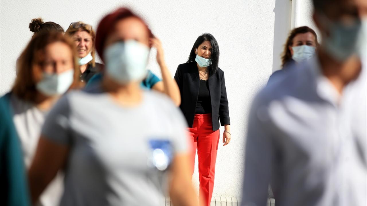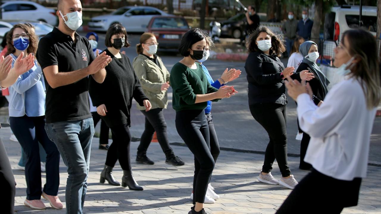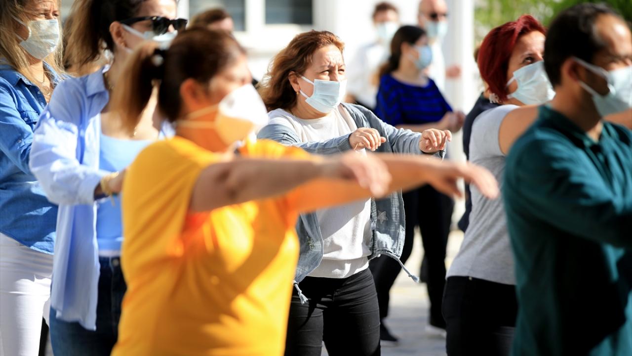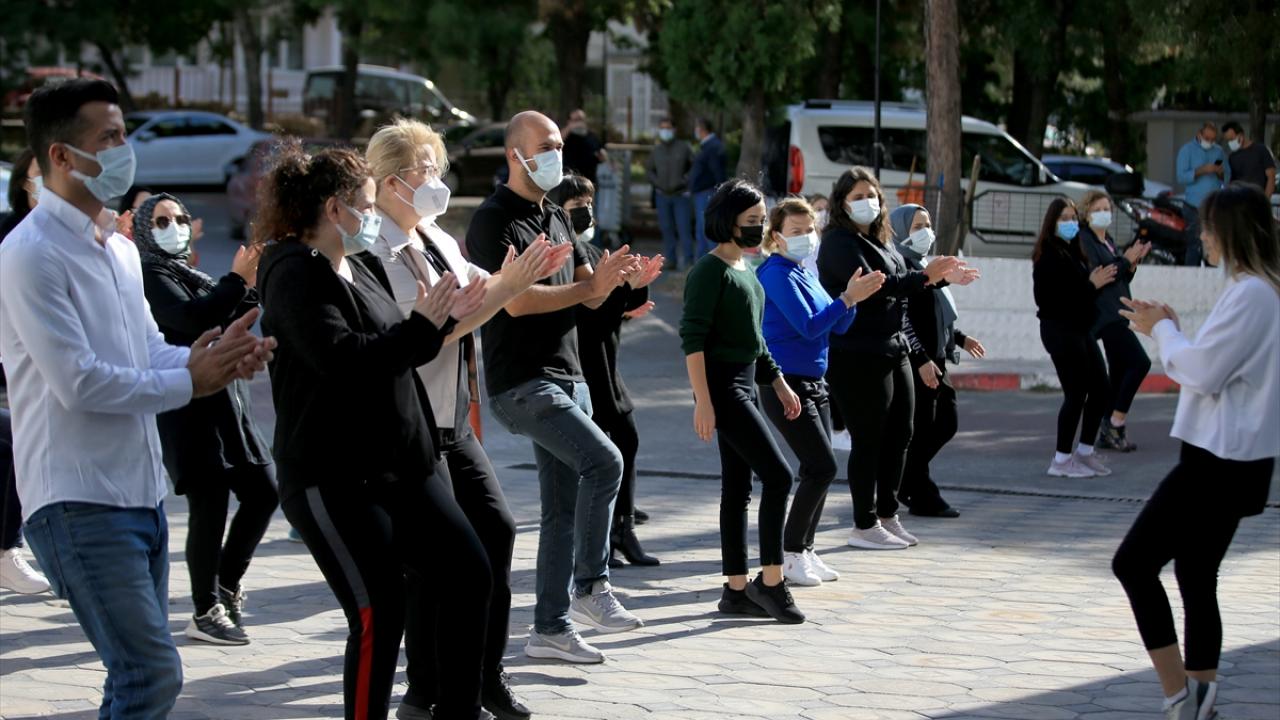 Sağlık çalışanları, fizyoterapist Nilgün Pehlivan öncülüğünde yaklaşık 30 dakika egzersiz yaptı.