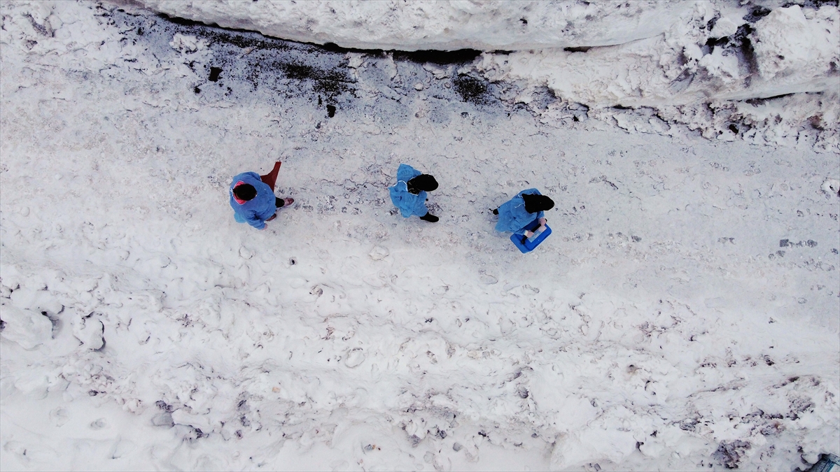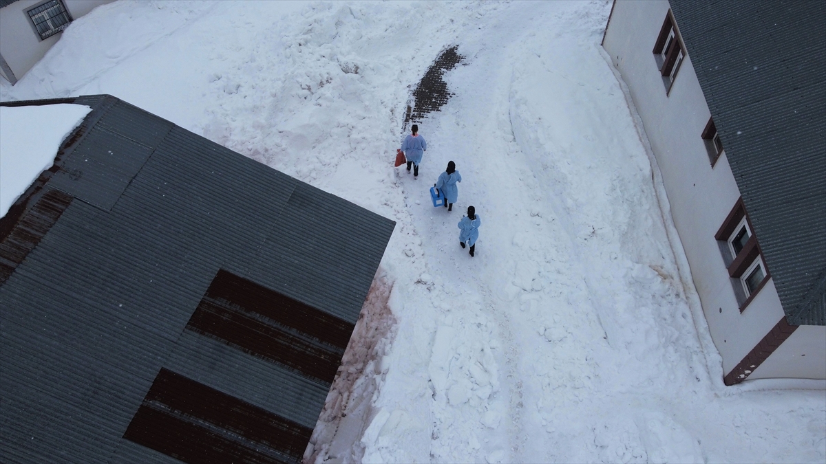 Kar nedeniyle aracın ilerleyemediği noktada yürüyerek eve ulaşan sağlık ekiplerini karşısında gören Çağan, büyük mutluluk yaşadı.