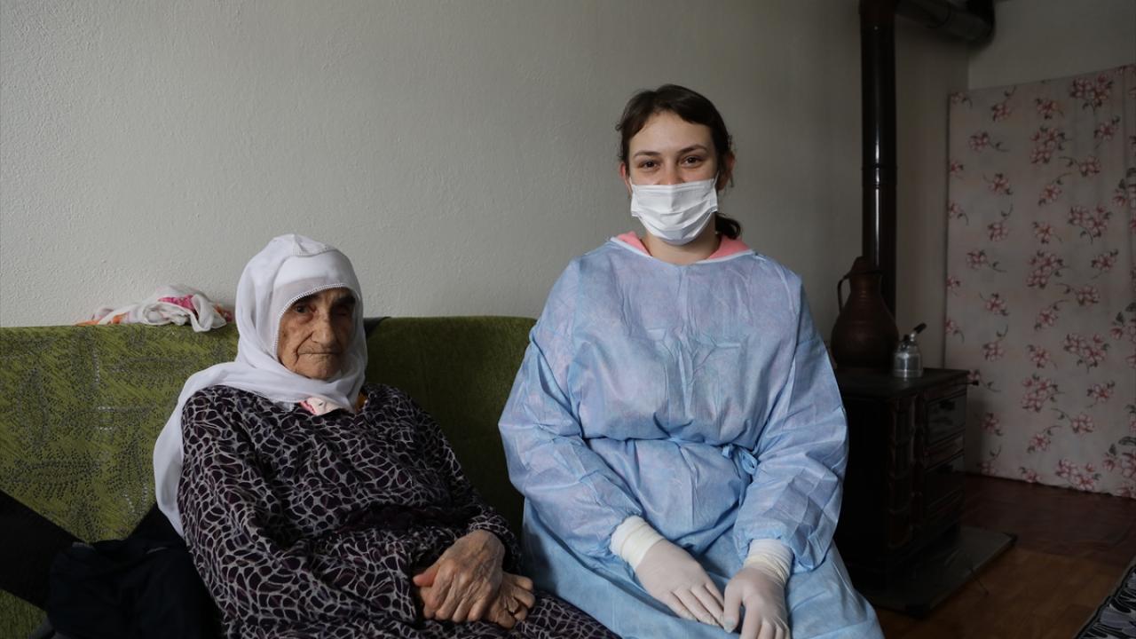 Sağlık ekipleri, rahatsızlıkları nedeniyle evinden çıkamayan Kartal köyünde yaşayan 88 yaşındaki Fatma Çağan`a aşı yapmak için yola koyuldu.
