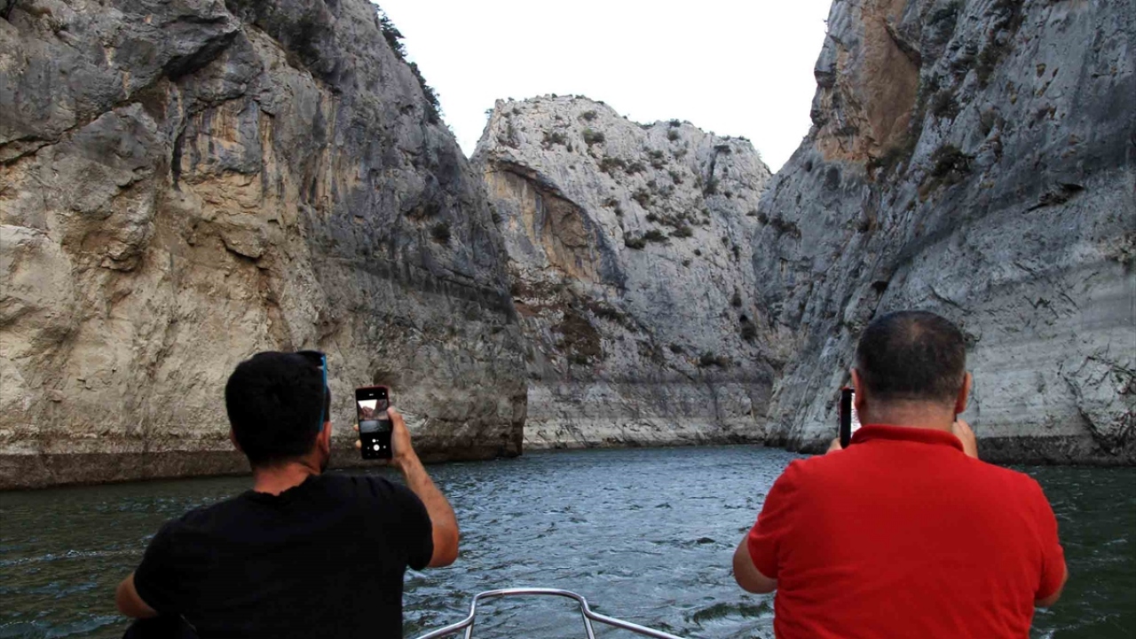 Ateş ölçümü yapılıp, eller dezenfekte edildikten sonra maskeyle kanyona alınan ziyaretçiler, yemyeşil ağaçların arasından süzülen baraj gölü kenarındaki parkurdan yürüyüp, teknelerle 3 kilometre uzunluğundaki kanyonda gezebiliyor.