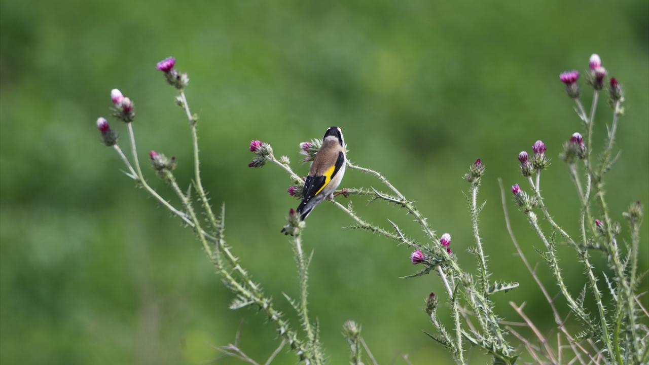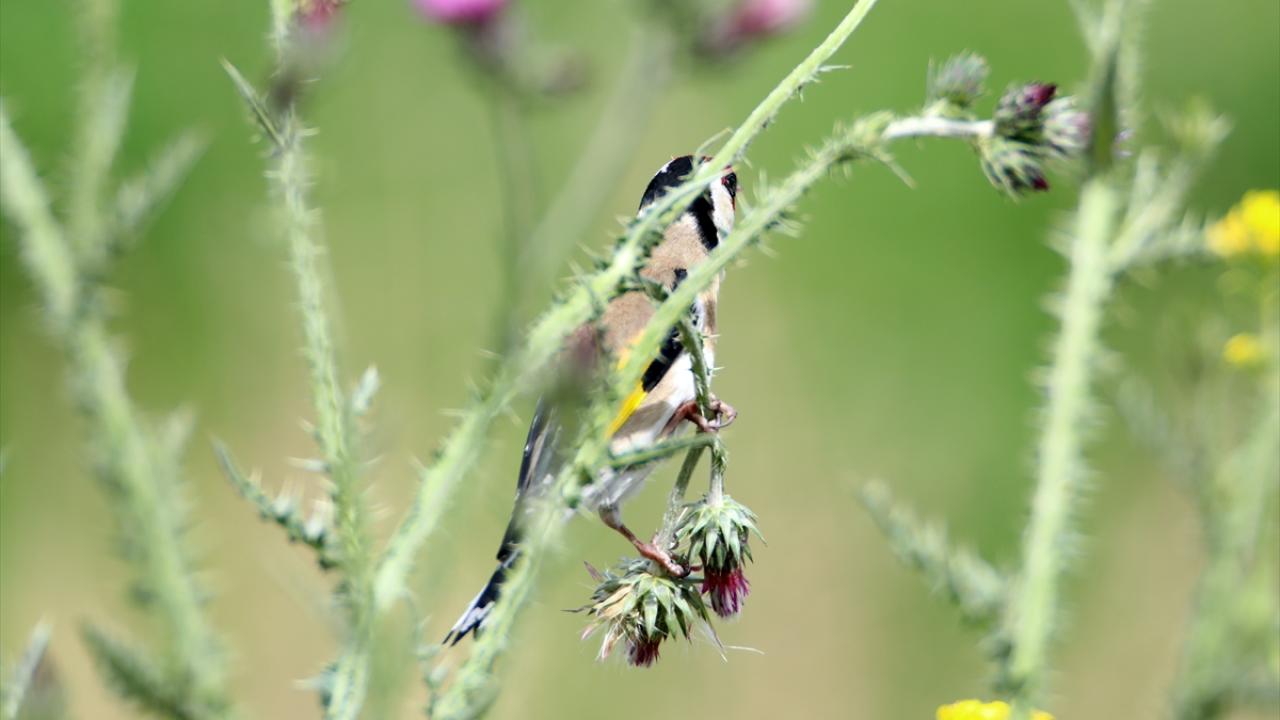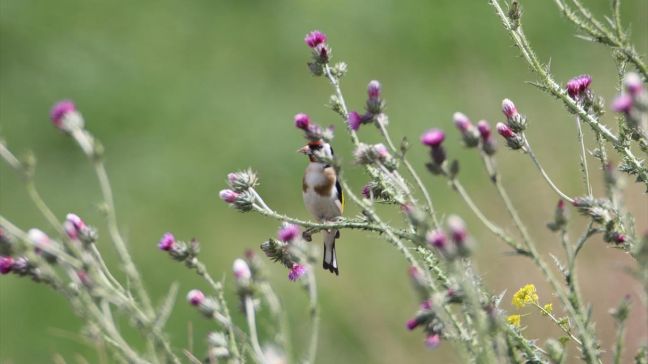 Ağrı Dağı Milli Parkı`nda çalışma yapan AA ekibi, deve dikeninin üstüne konarak beslenen saka kuşlarını görüntüledi.