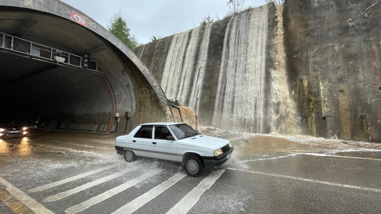 Dağlardan gelen yağmur suyu nedeniyle Amasra Tüneli`nde su birikintisi oluştu, araçlar güçlükle ilerdi.