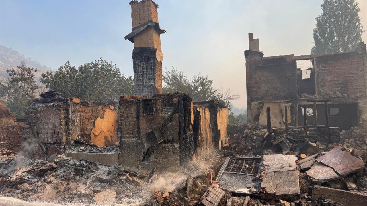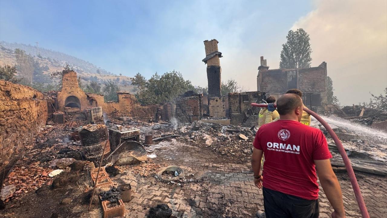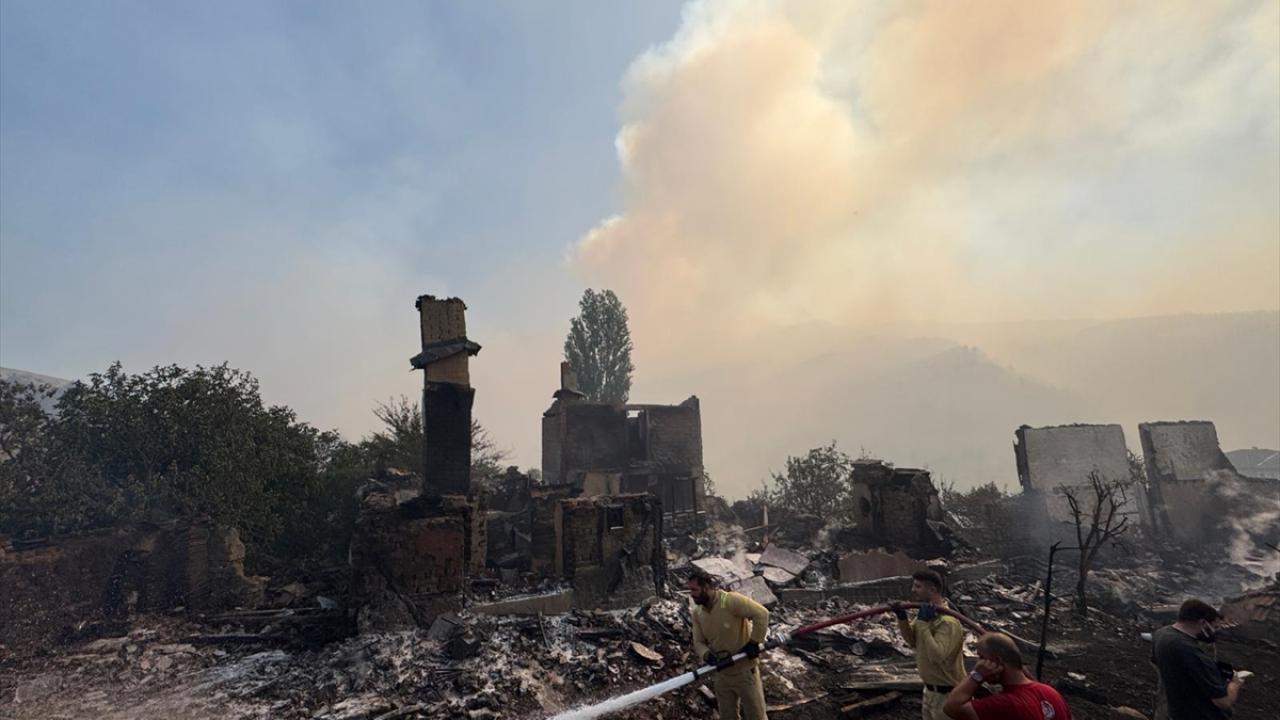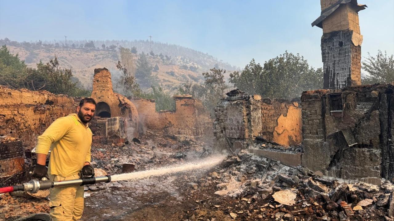 Yoğun dumanın hakim olduğu bölgede ekipler, söz konusu mahallelerde yanan ev ve yapılarda soğutma işlemi yapıyor.