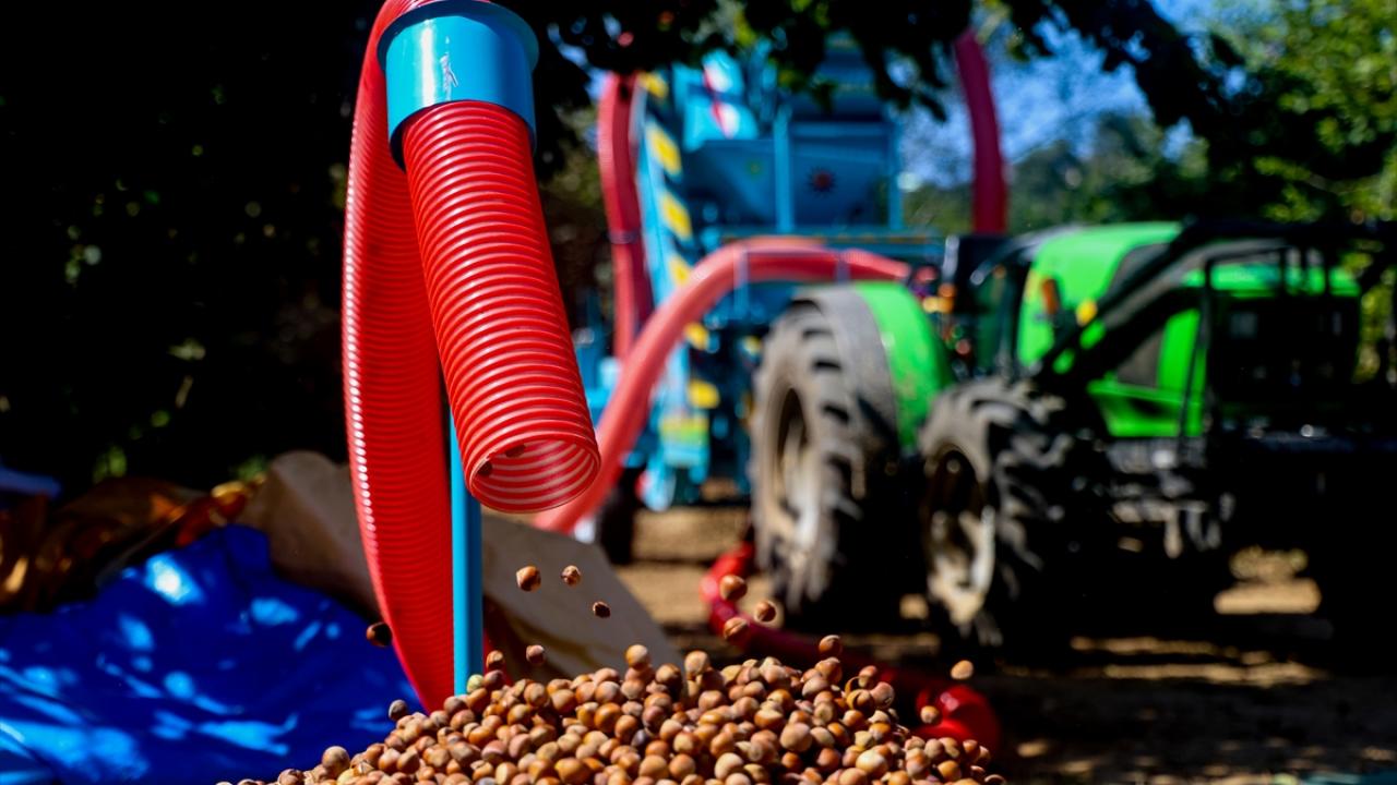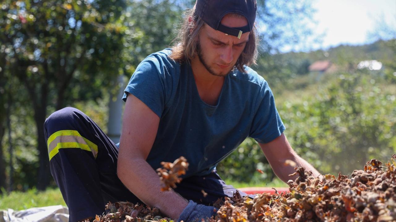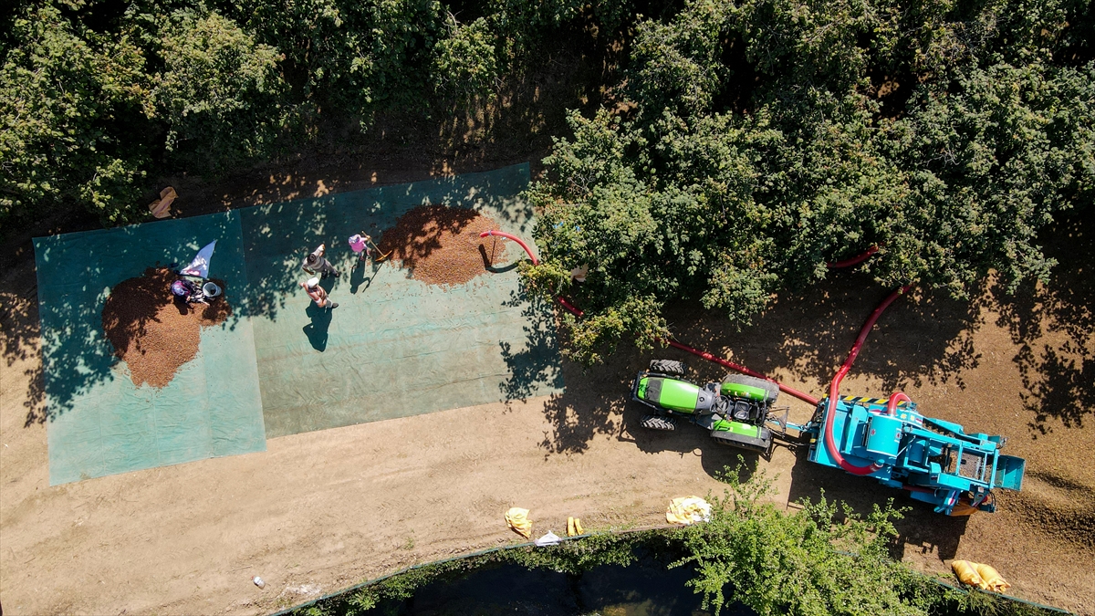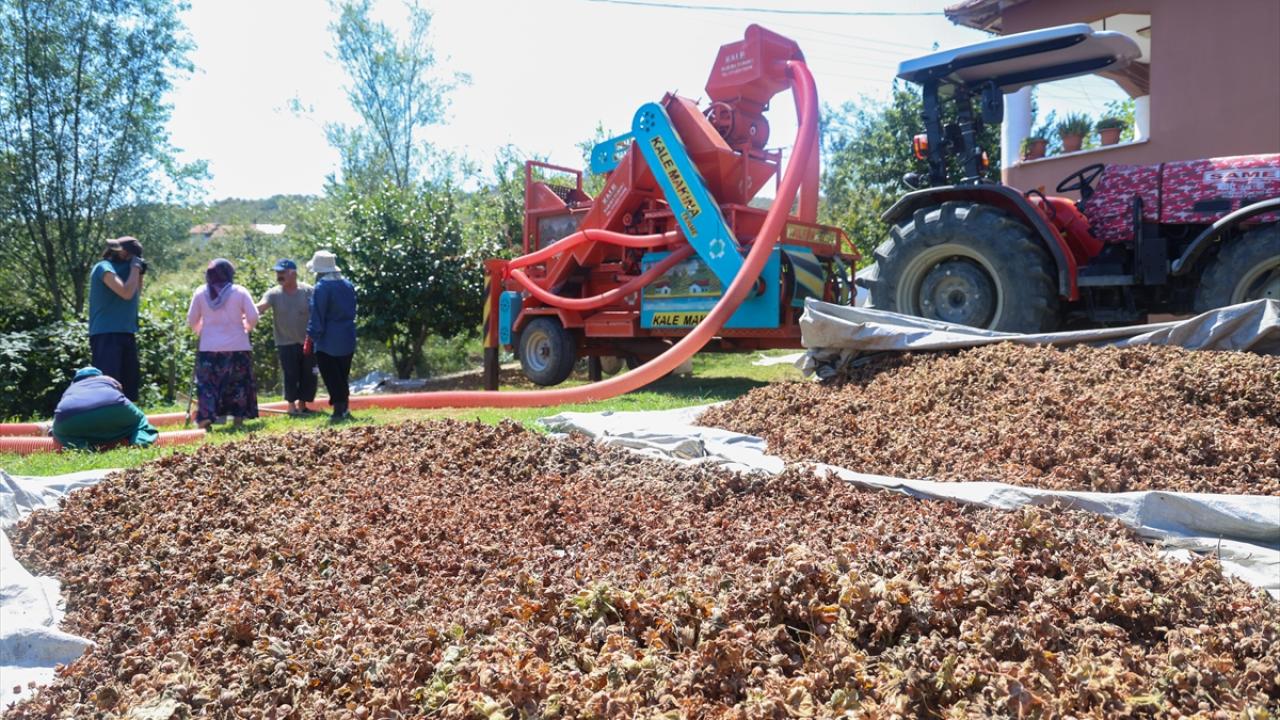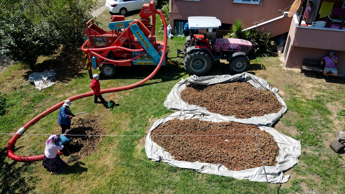167 bin dekar dikili fındık arazisiyle fındık üretiminin önemli merkezlerinden Kocaali ilçesinde fındık toplamaya devam eden çiftçiler, kuruttukları ilk hasadı kabuğundan ayırmak için patoza vermeye başladı.