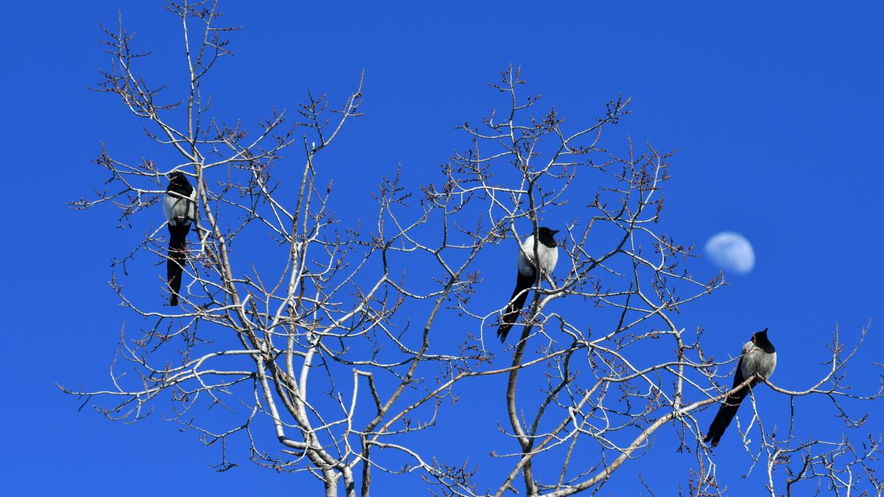 Kars'ın Sarıkamış ilçesinde akşam saatlerinde ağaç dallarına konan saksağanlar, birlikte güzel görüntü oluşturdu.