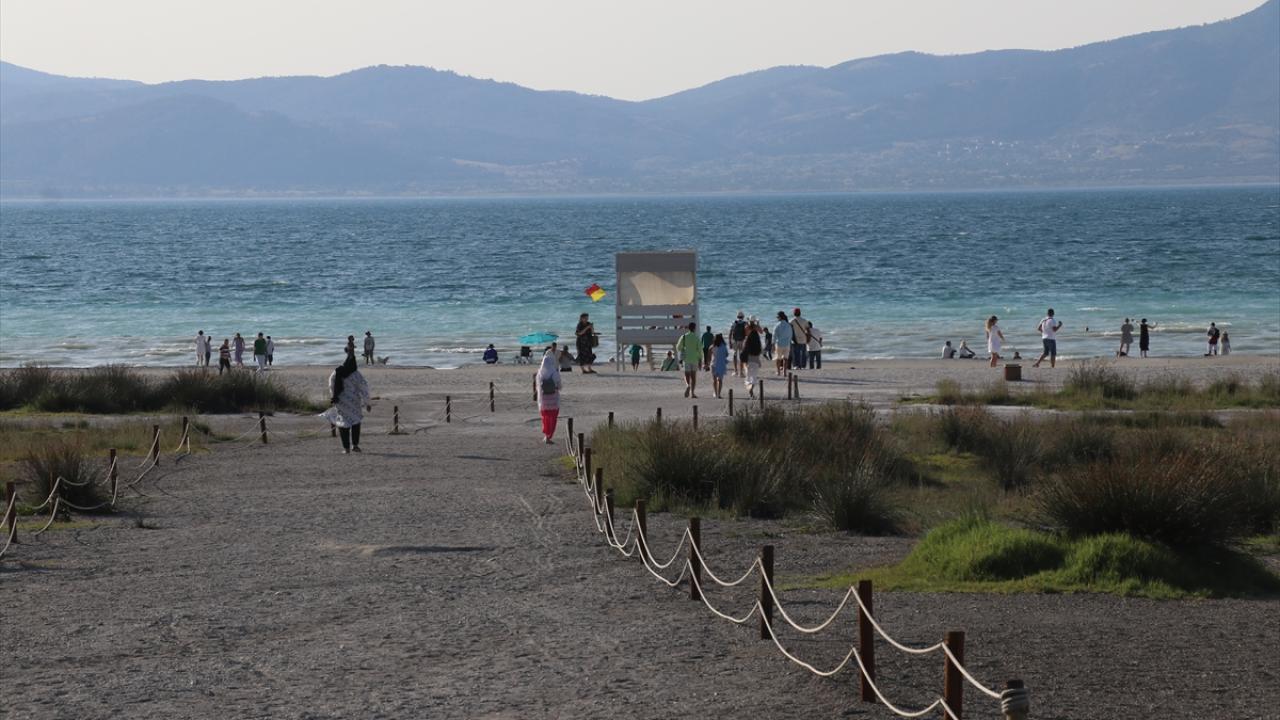 Aşırı yoğunluk oluşmayacak şekilde izin verilen plaj bölgesine geçen tatilciler, Salda`yı yakından görme ve serin suyuna girme fırsatı elde ediyor.