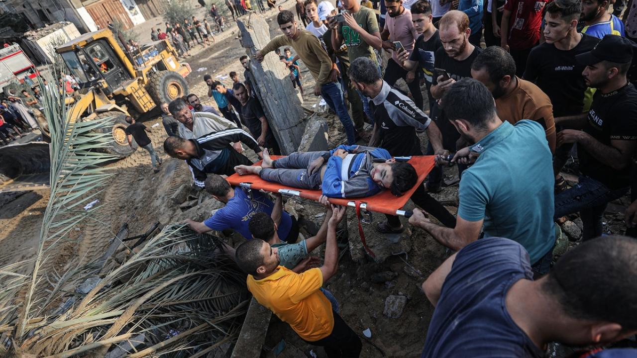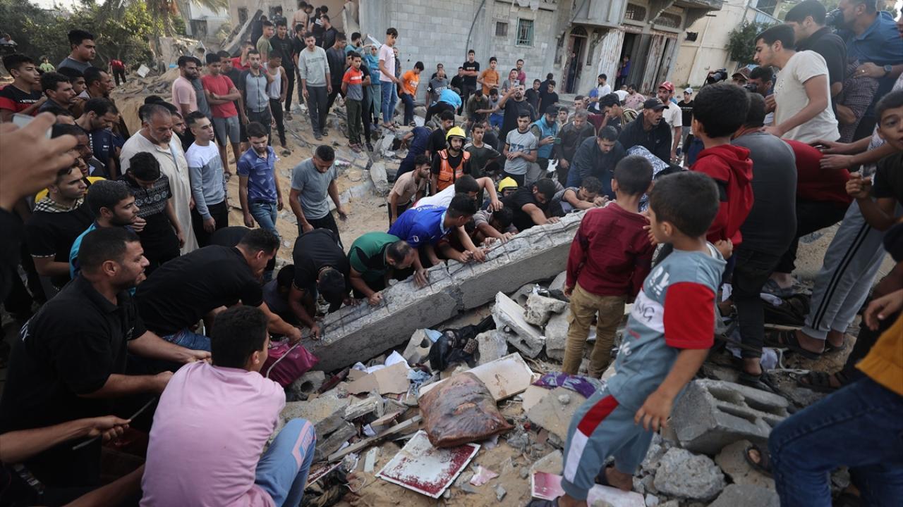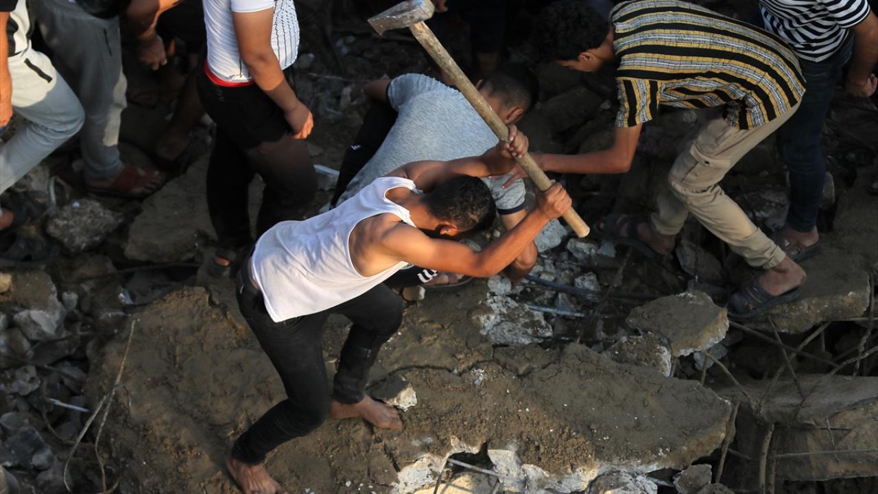 Han Yunus kentine düzenlenen saldırılarda yerle bir olan Mısri ailesine ait eve gelen sivil savunma ekipleri ve bölge sakinleri arama kurtarma çalışması başlattı.