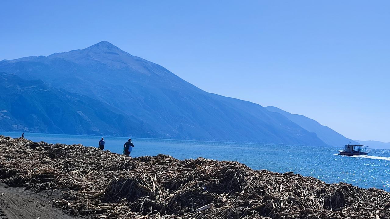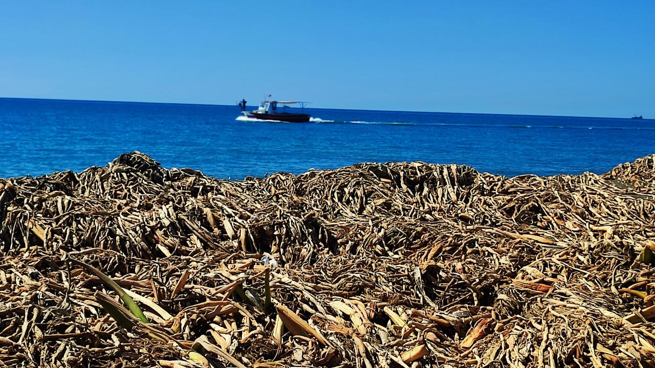 Hatay'da sağanak nedeniyle Asi Nehri'nden taşan suların getirdiği sümbüllerle kaplanan Samandağ sahilleri ve deniz, ekiplerce temizleniyor.