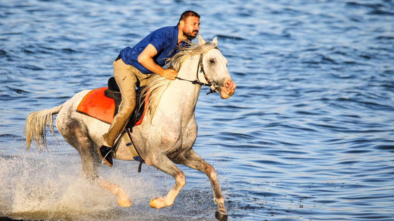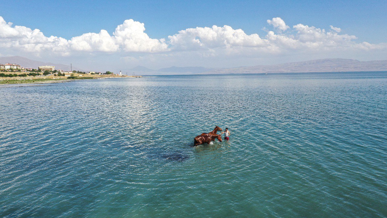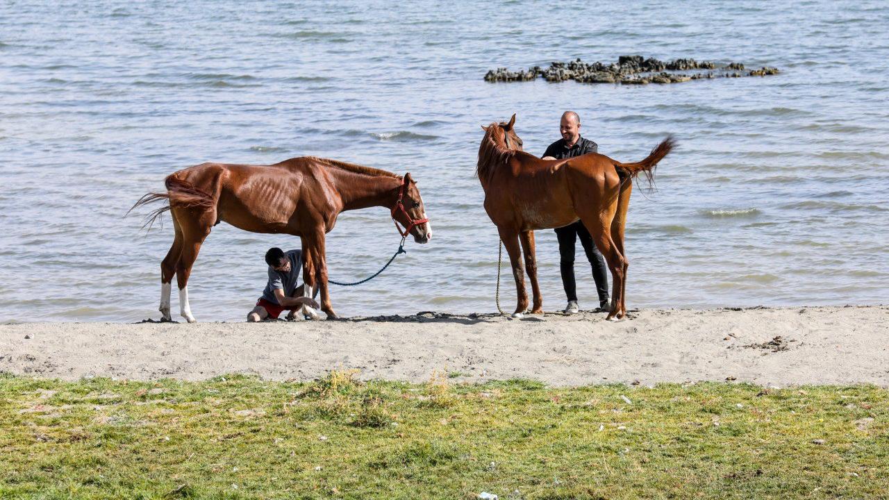 Şampiyon atlar Van Gölü'nün tuzlu ve sodalı suyunda "form" tutuyor