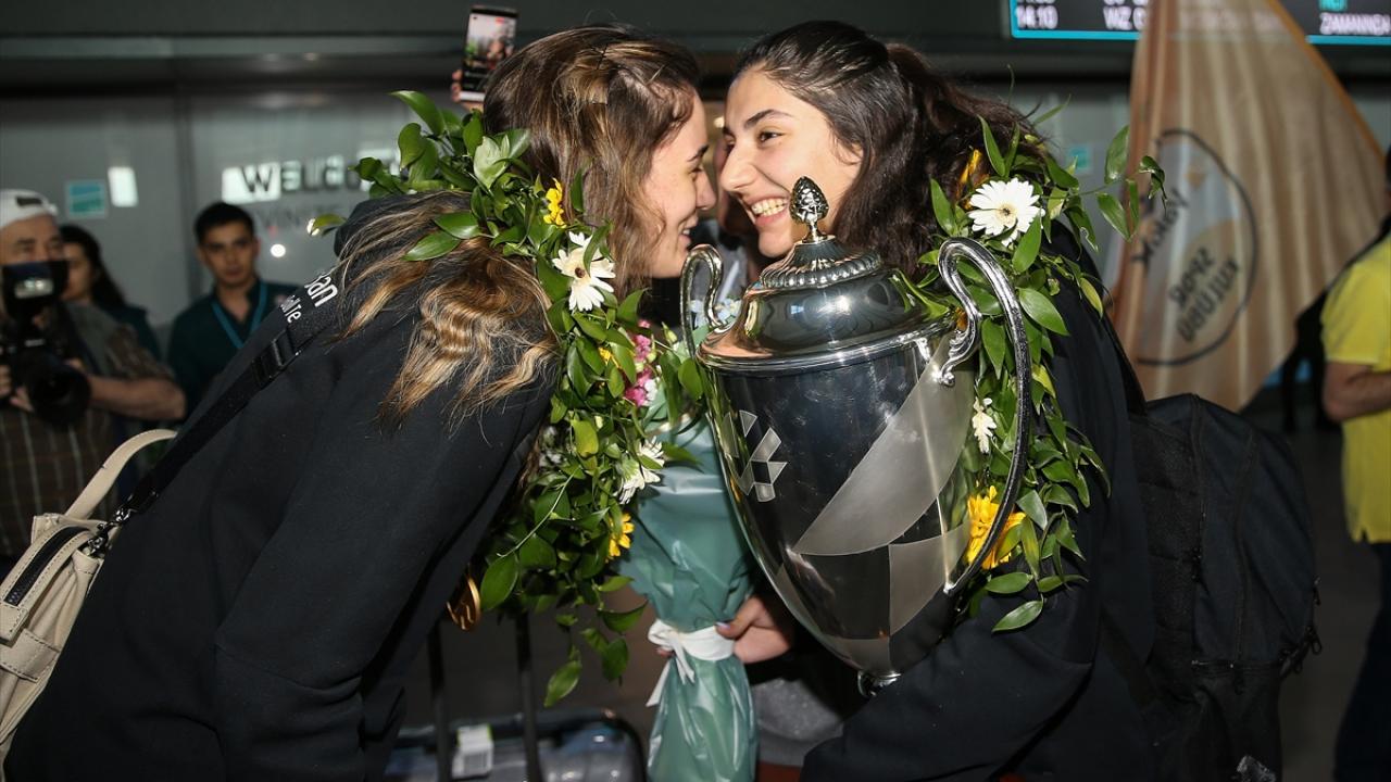 Bando ekibinin de marşlar çaldığı karşılamada sporcular, taraftarla şampiyonluğu kutladı.