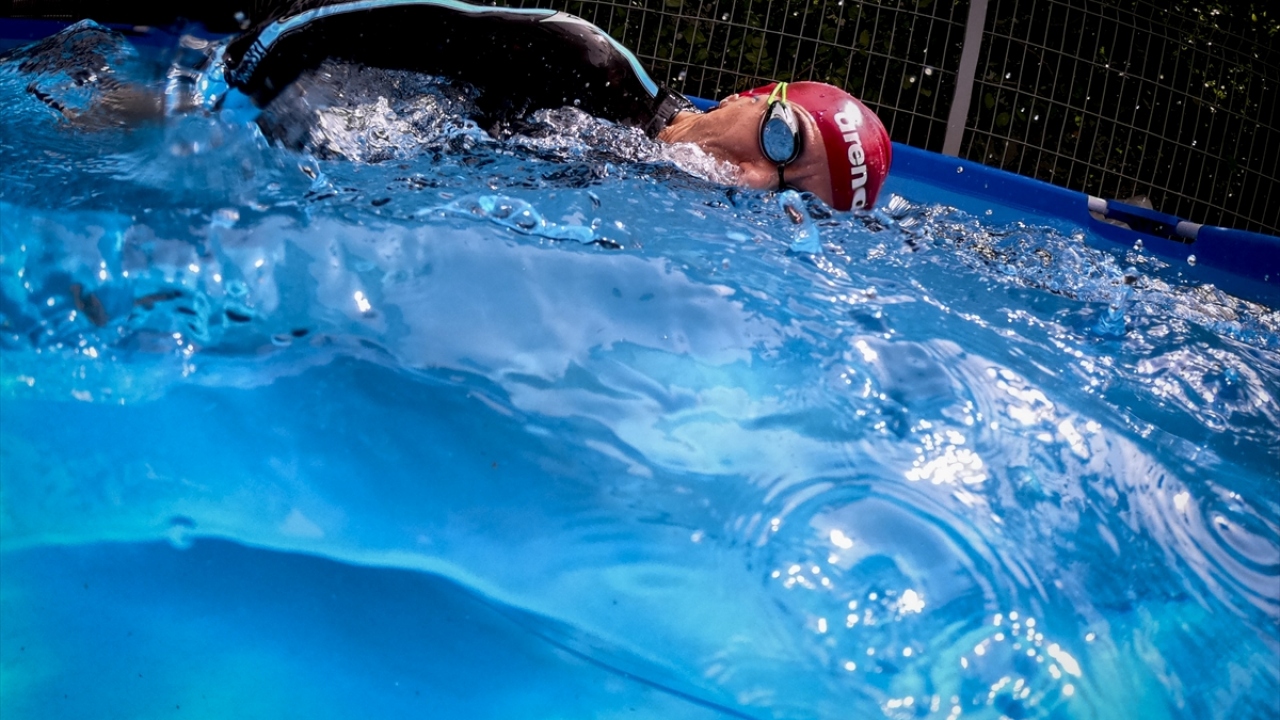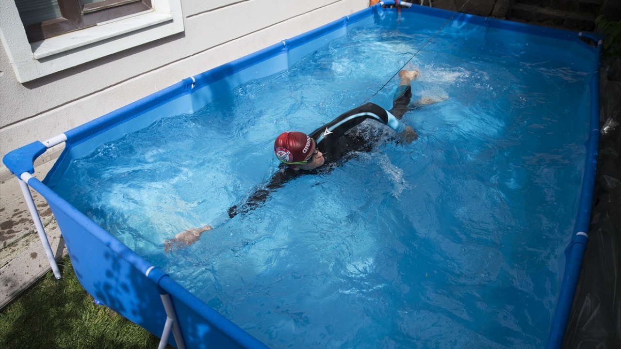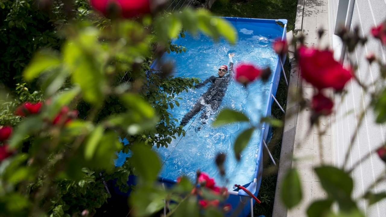 Şampiyon yüzücü antrenmanlarını evinin bahçesinde yapıyor