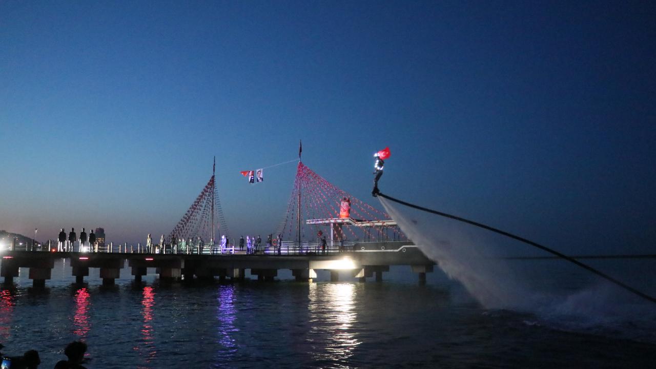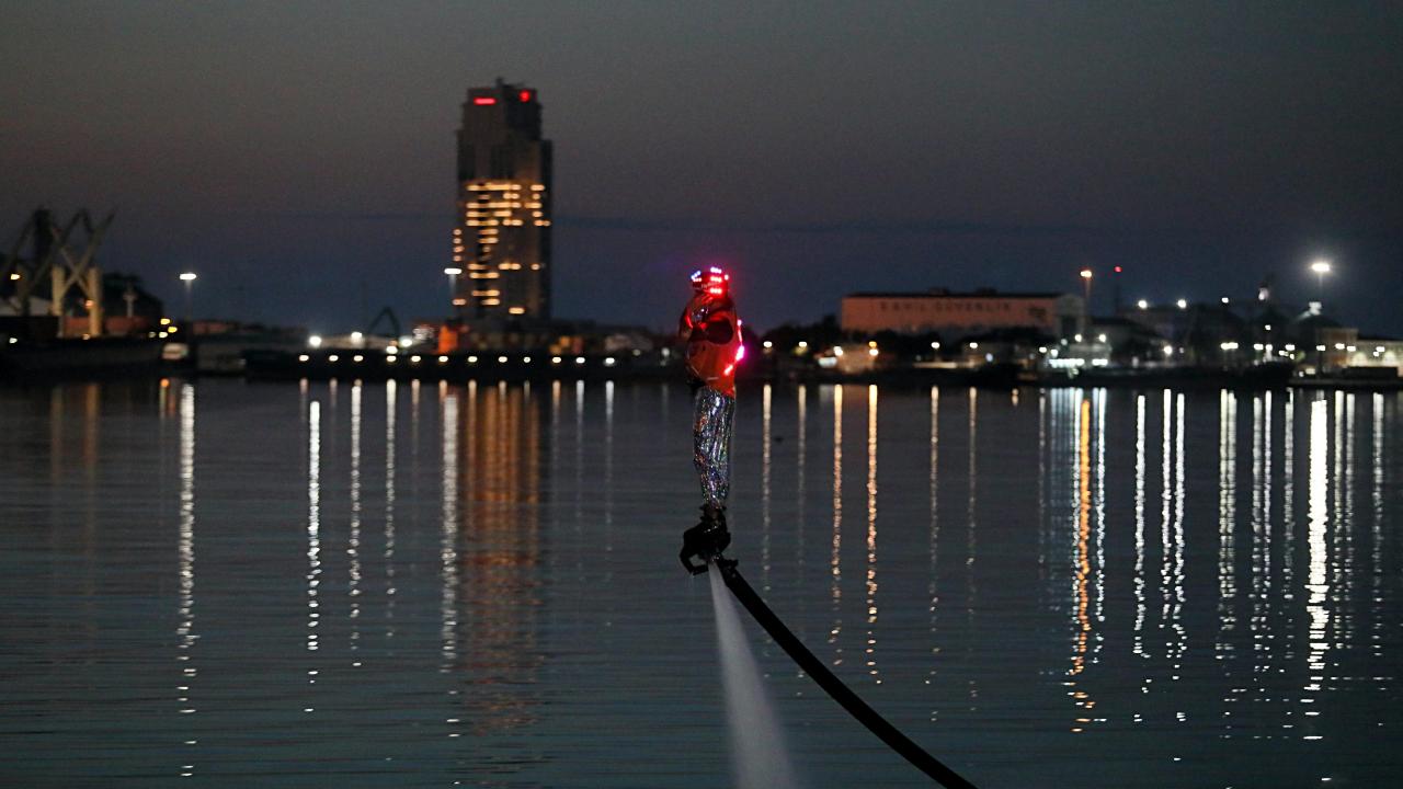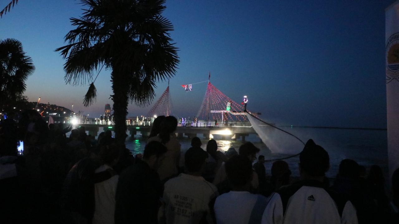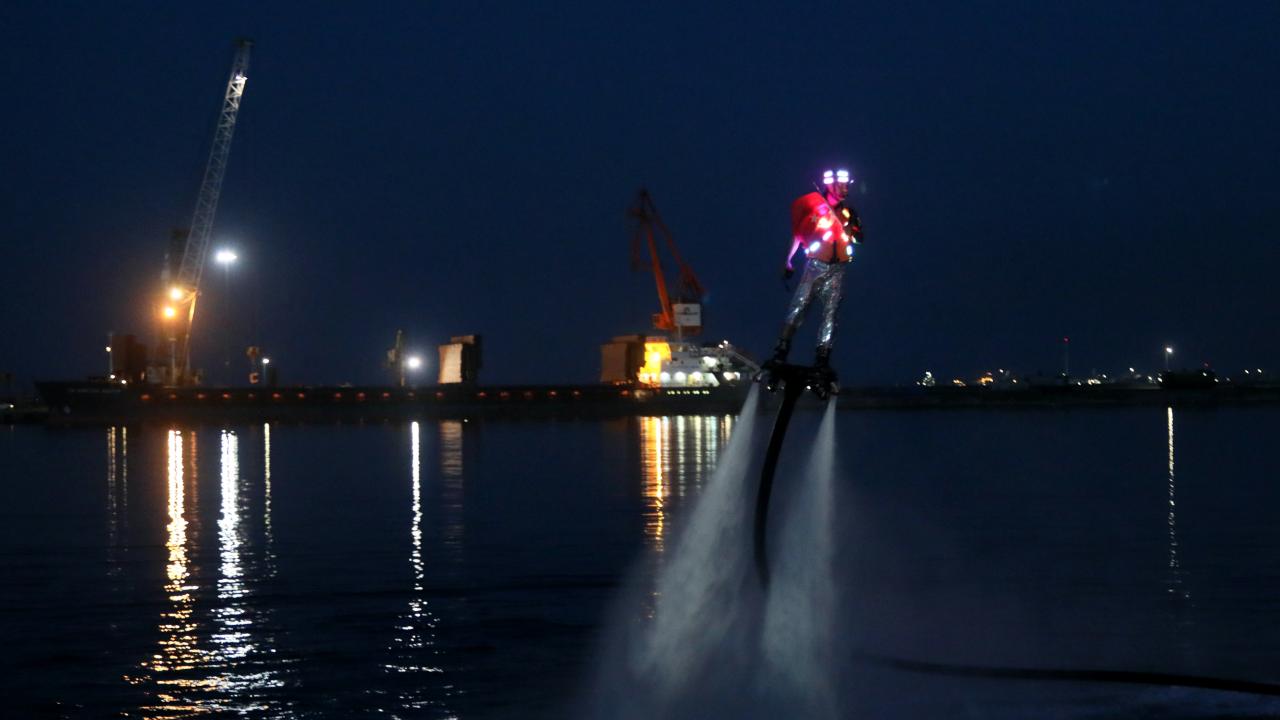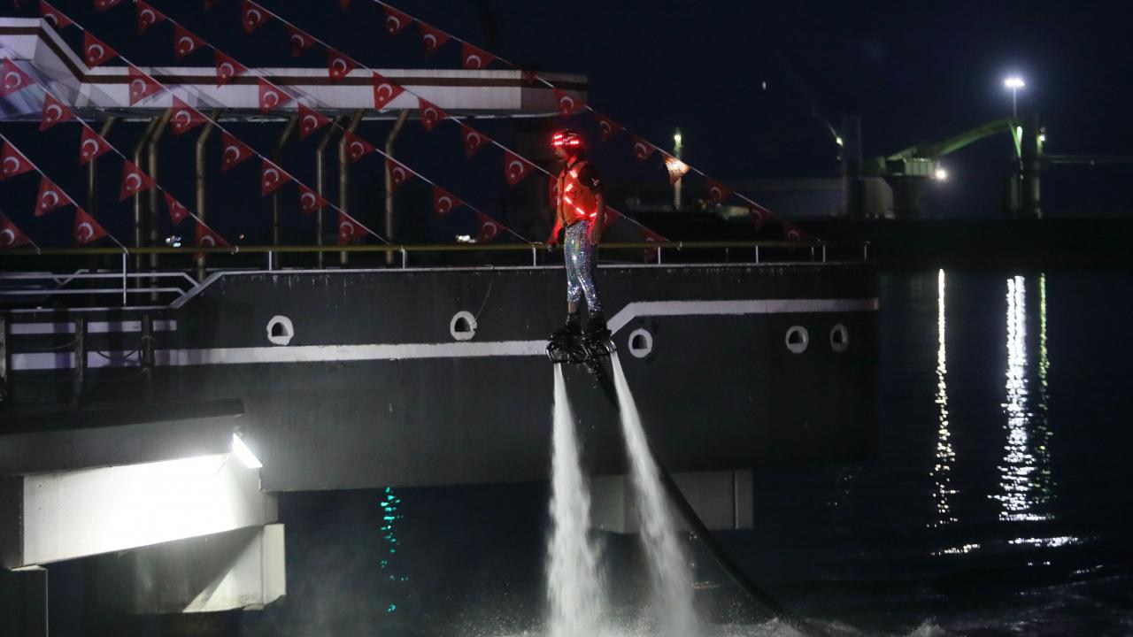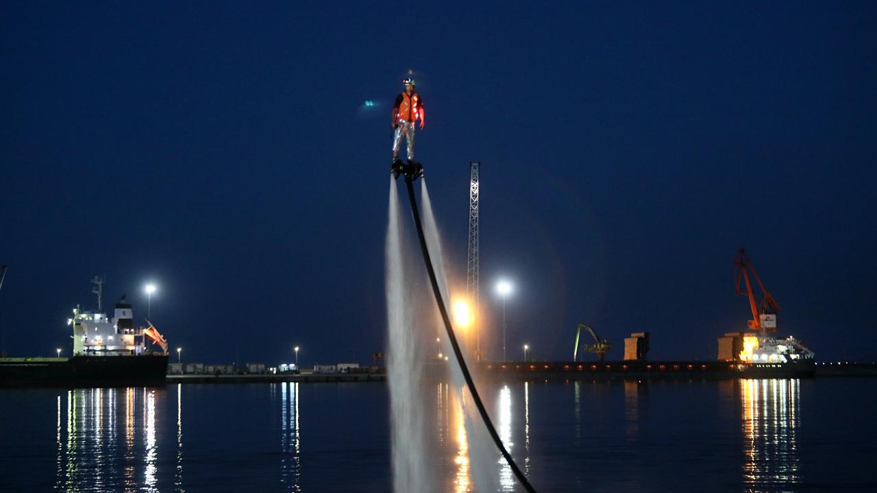 Su sporcusu Ali Komşusu`nun yaptığı flyboard gösterisi akşam saatlerinde ışıklarla güzel görüntüler oluşturdu.