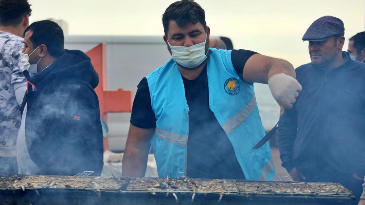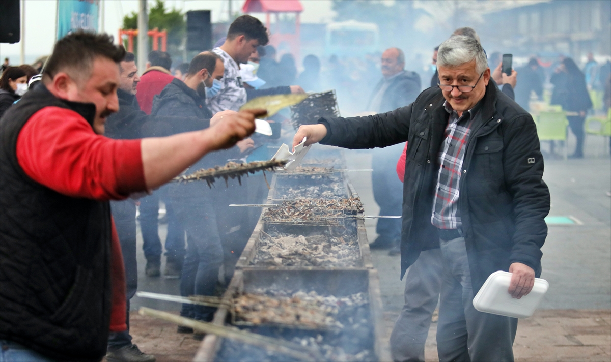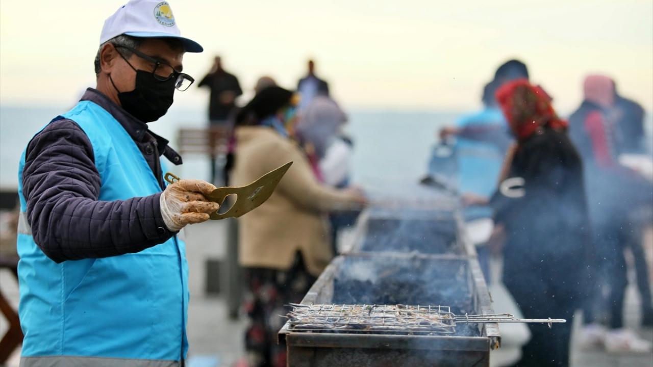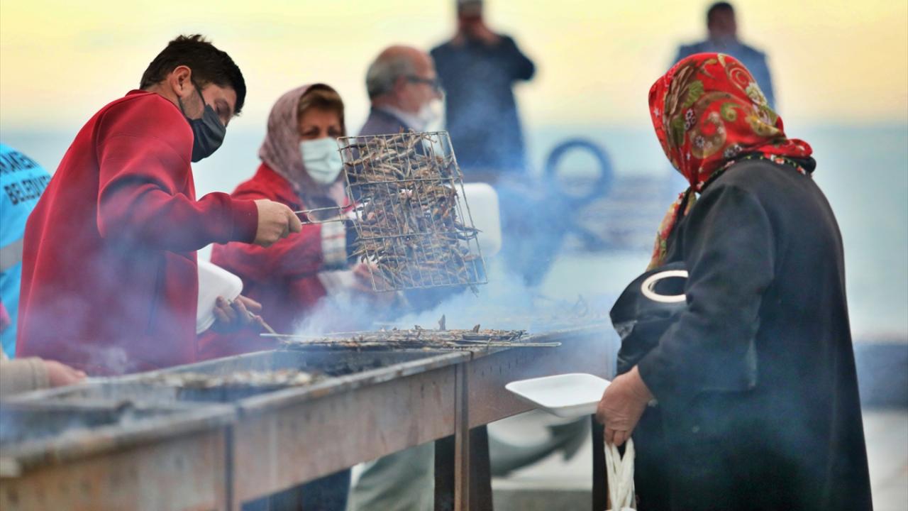 Temizlenen hamsiler, vatandaşlar ve belediye personelince metrelerce kurulan mangallarda pişirilerek dağıtıldı.