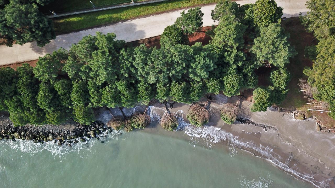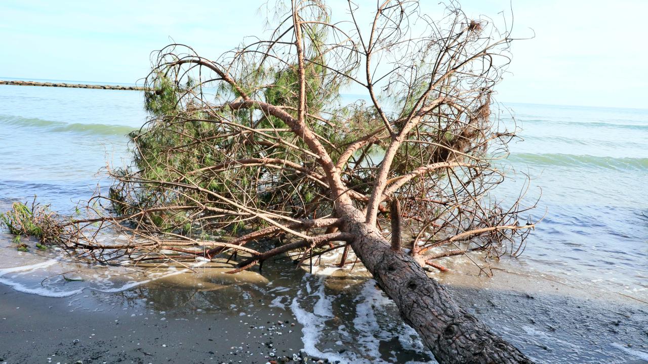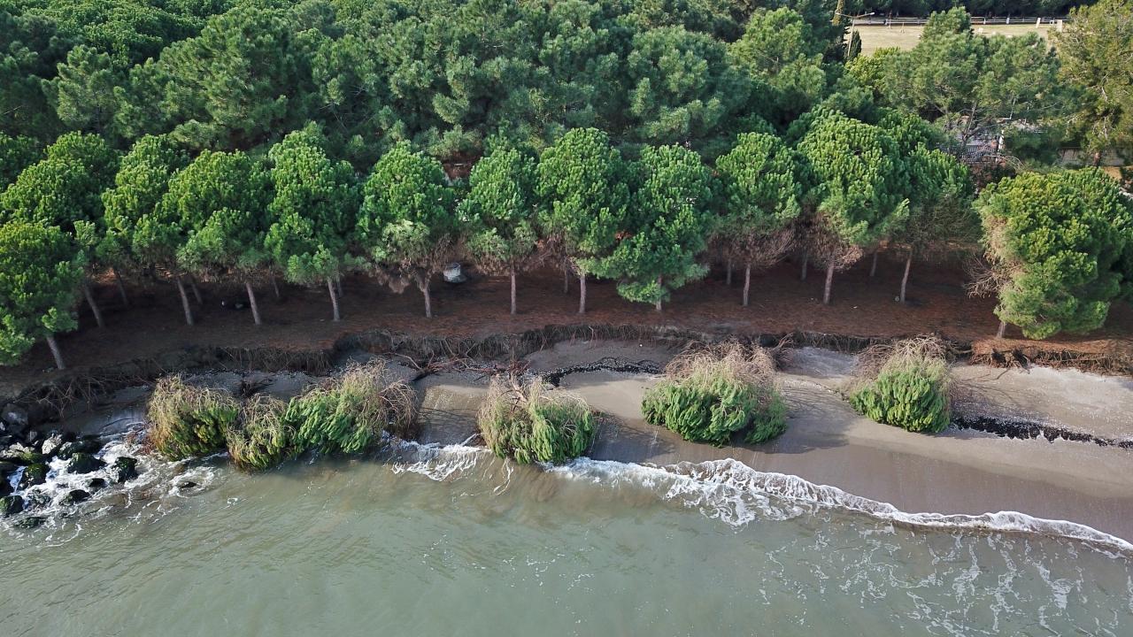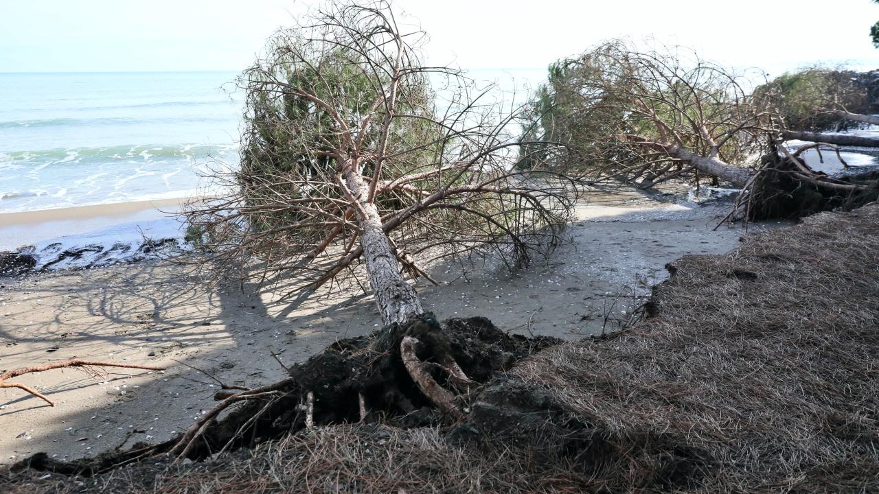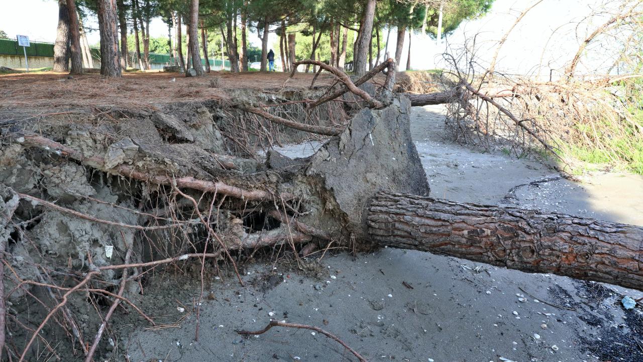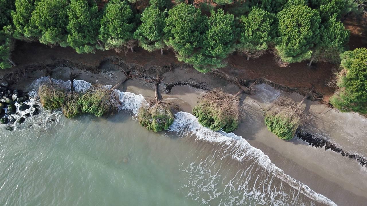 Samsun'un Atakum ilçesine bağlı Yalı Mahallesi'nde etkili olan kıyı erozyonu, sahildeki çam ağaçlarının kökünden devrilmesine yol açtı.