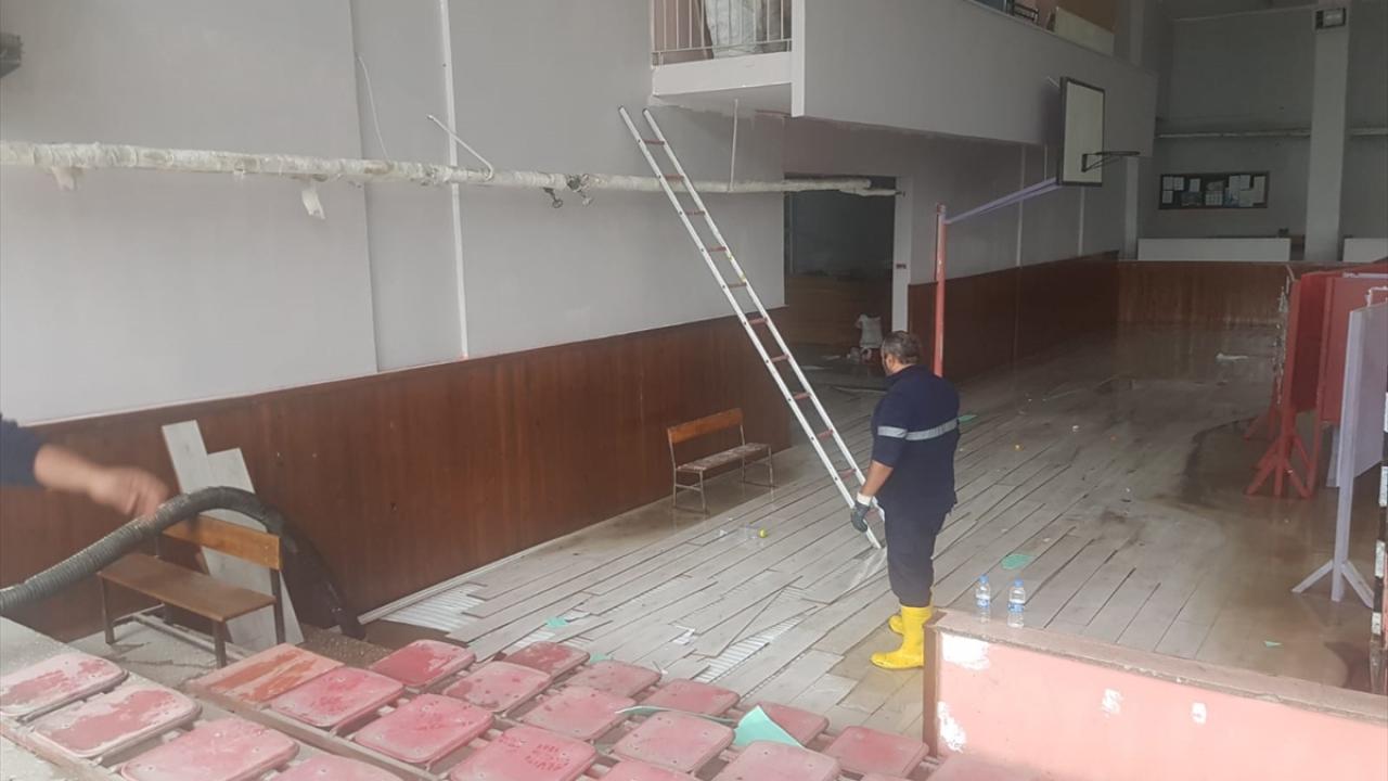 Atatürk Ortaokulunun spor salonunda su basması nedeniyle hasar meydana geldi.