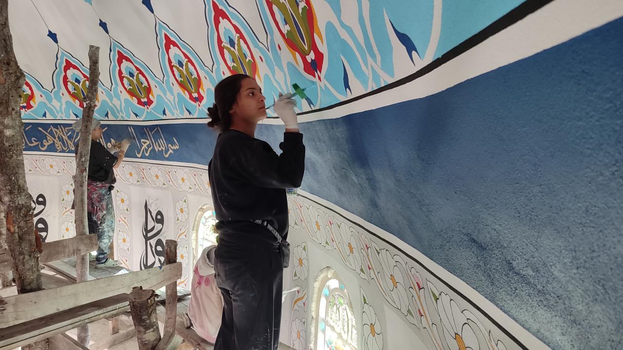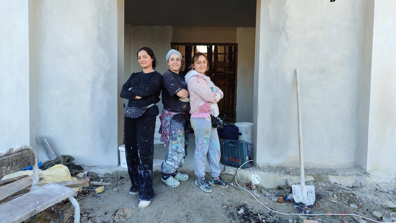 Aynur Şeker, Nazlı Cezan ve Işık Kahrıman, süslemesini yapacakları camilerde iskeleyi kurduktan sonra boyalarını ve diğer malzemelerini hazırlıyor.