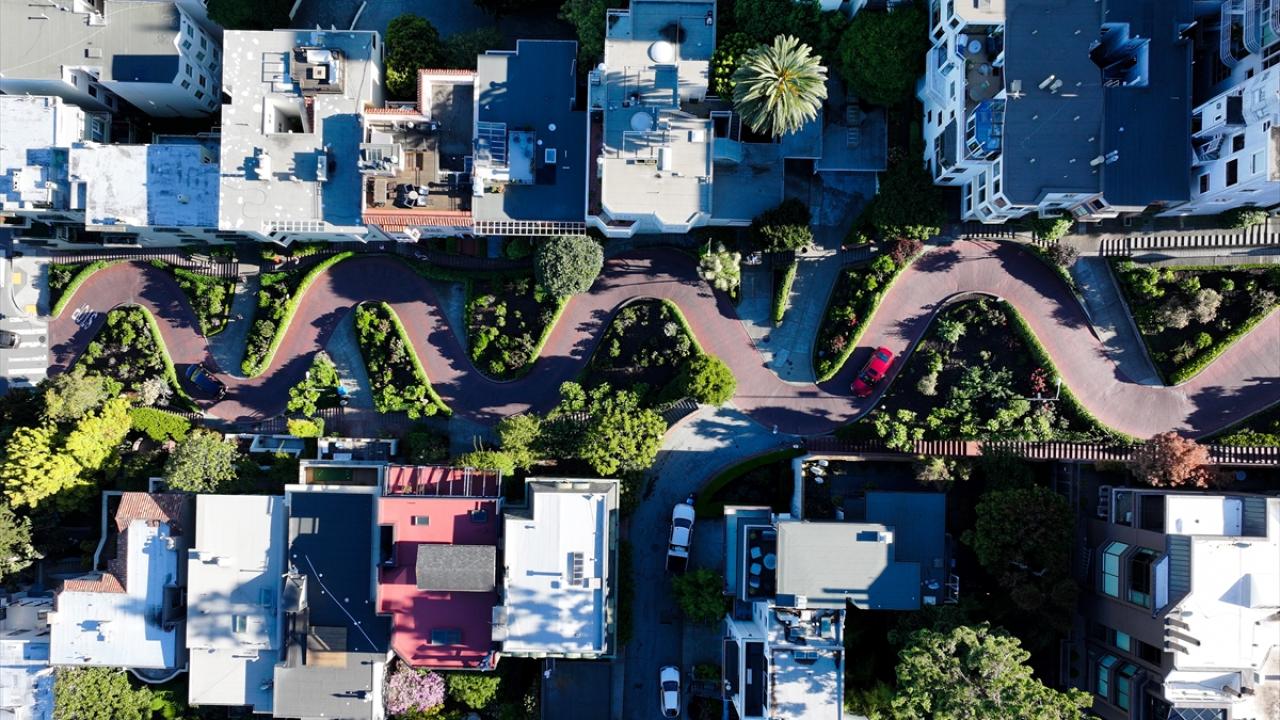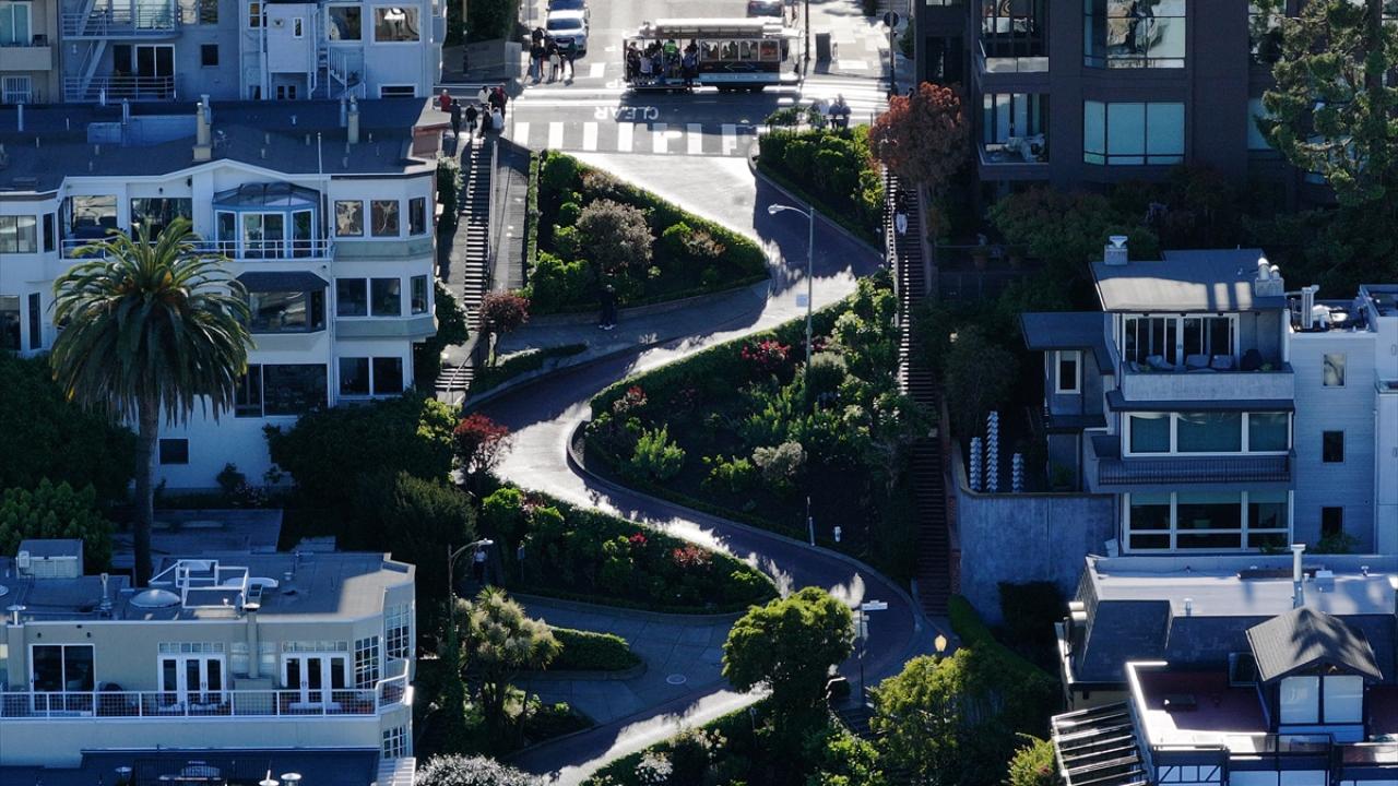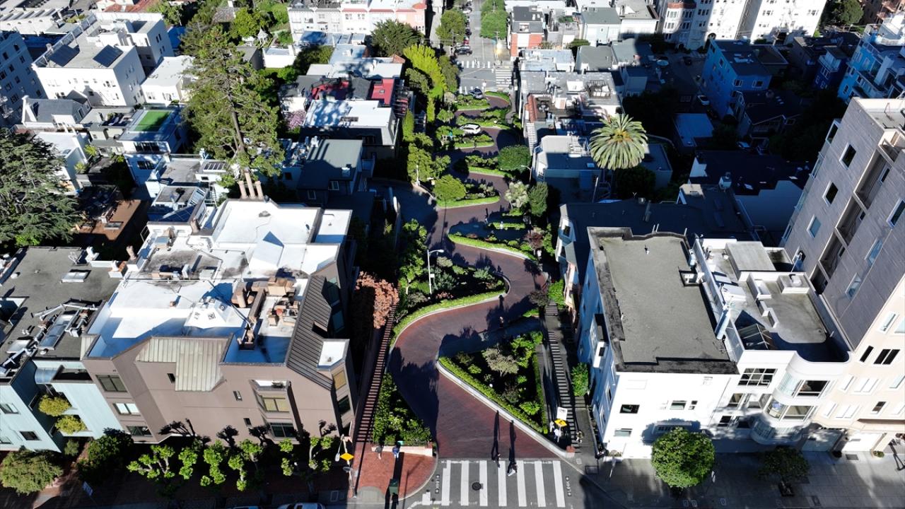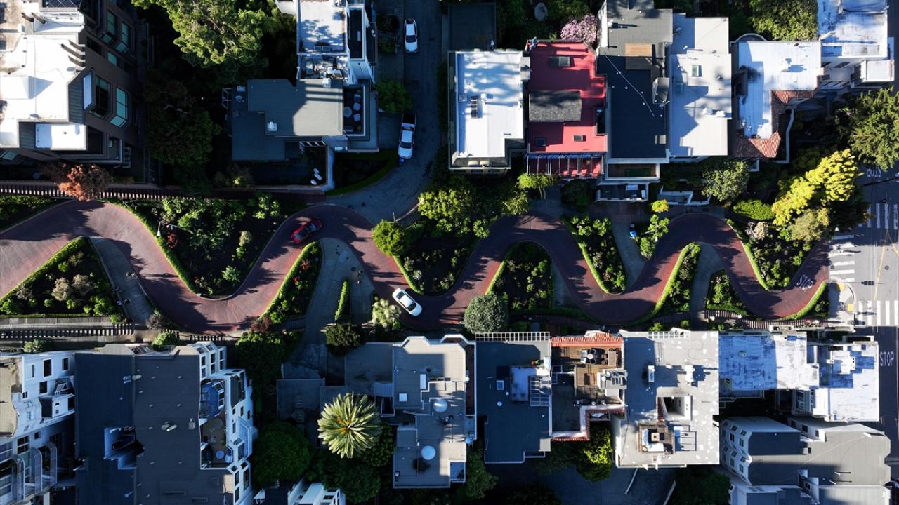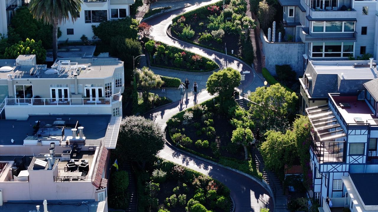 ABD'nin Kaliforniya eyaletinin San Francisco kentinin simge noktalarından biri olan ve “Dünyanın en virajlı sokağı” olarak bilinen Lombard Caddesi, sekiz keskin virajdan oluşan dik yapısıyla dikkat çekerken havadan görüntülendi.