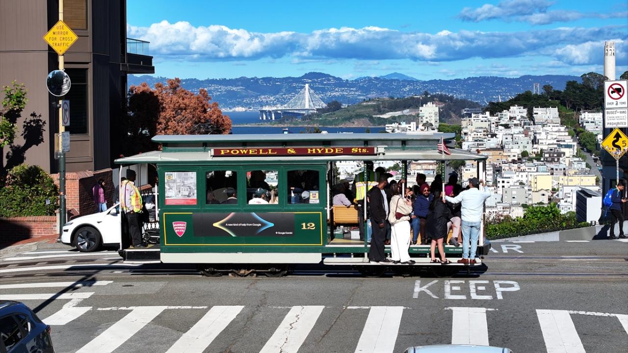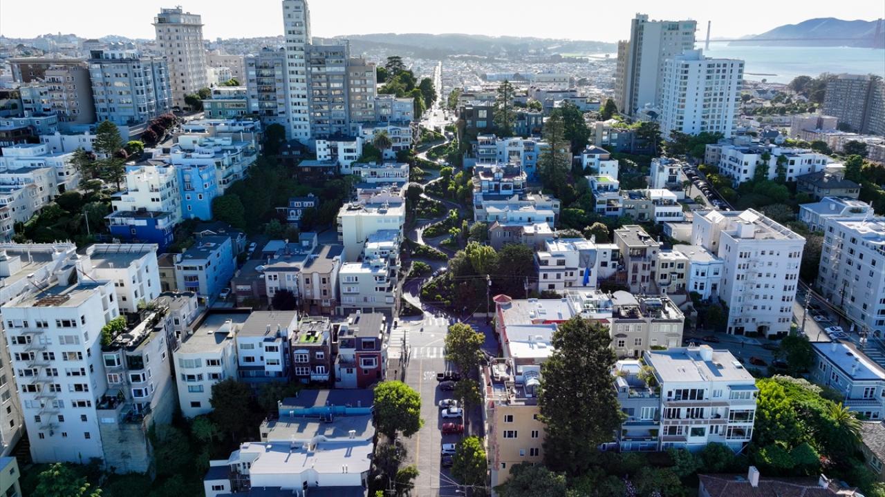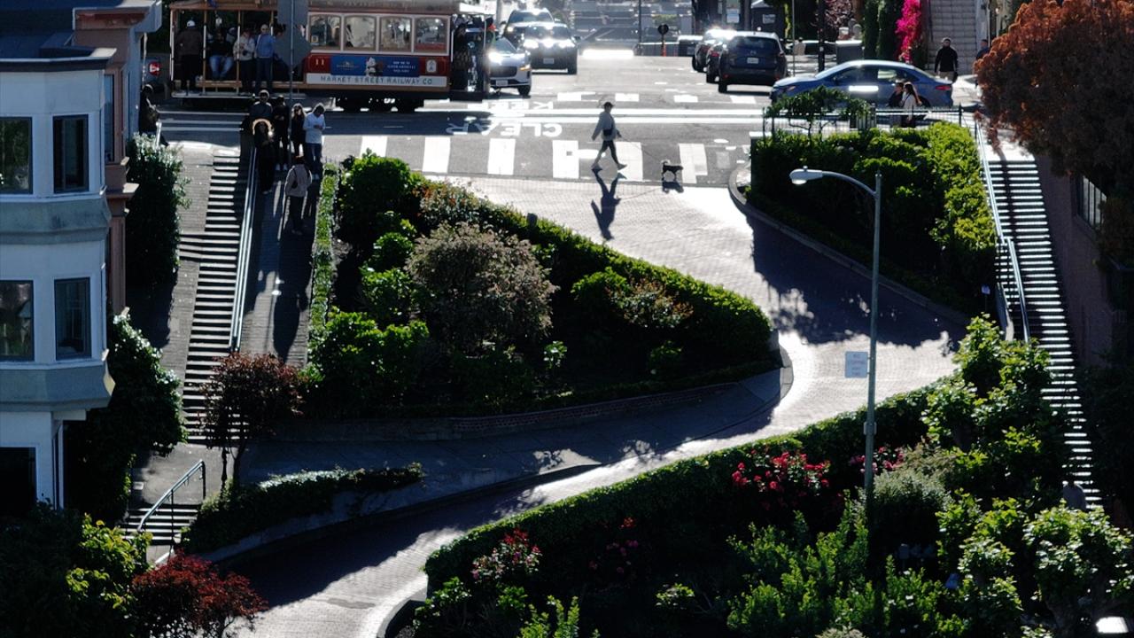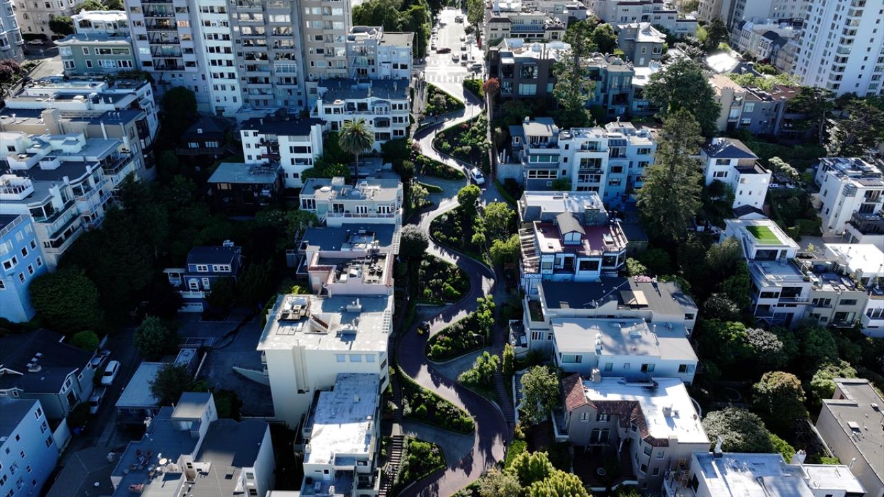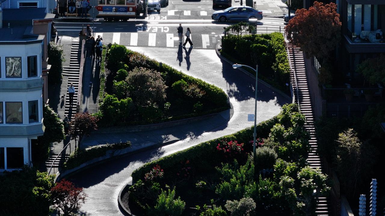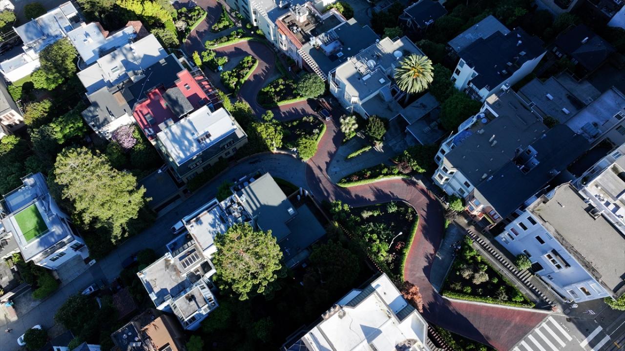 ABD'nin Kaliforniya eyaletinin San Francisco kentinin simge noktalarından biri olan ve “Dünyanın en virajlı sokağı” olarak bilinen Lombard Caddesi, sekiz keskin virajdan oluşan dik yapısıyla dikkat çekerken havadan görüntülendi.