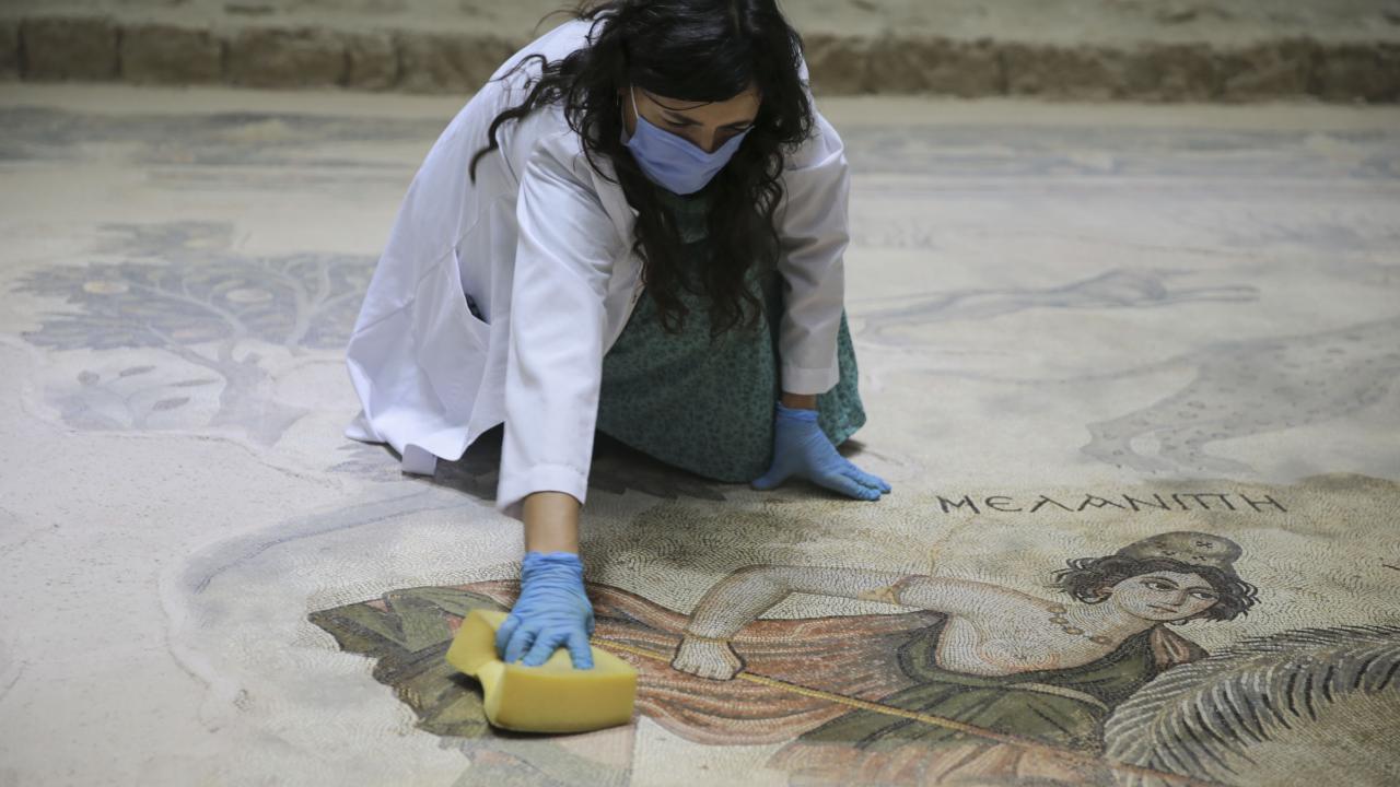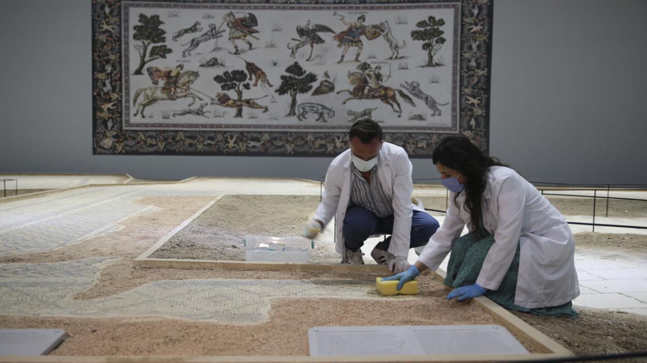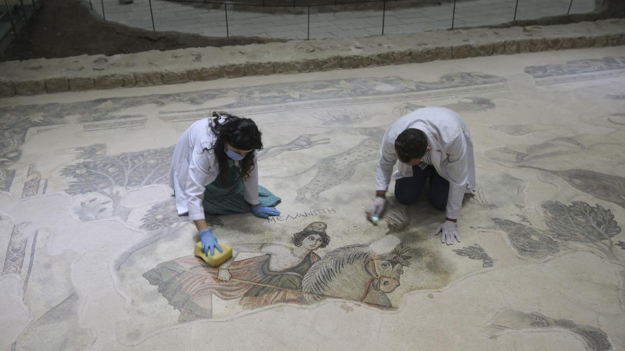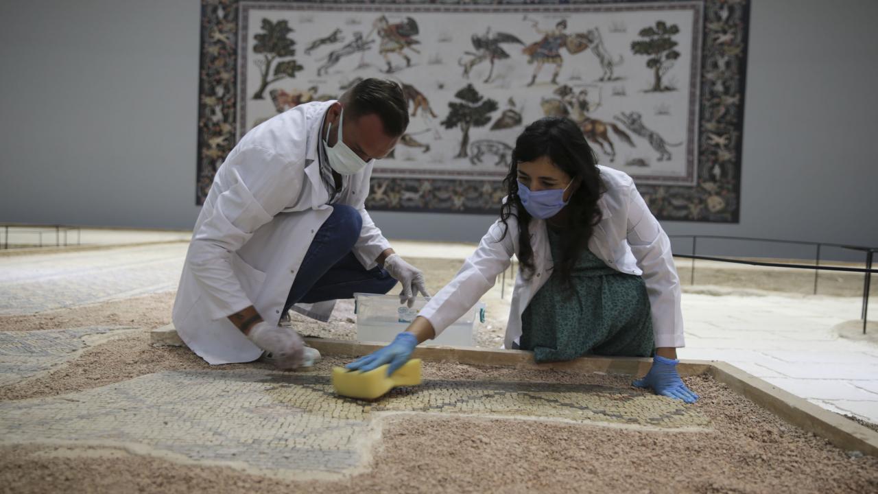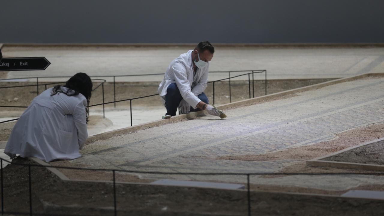 "Burada Roma dönemine tarihlenen bir saray yapısı var ve içerisinde de çeşitli mozaikler resmedilmiş. Özellikle bu mozaiklerin üzerindeki mitolojiler, betimlemeler çok önemli. Bunlardan en önemlisi de amazon kadınlarının resmedilmiş olduğu mozaikler. Mozaik müzemiz sürekli restoratör arkadaşlarımız tarafından kontrol ediliyor, bozulmalar, kirlenmeler, tozlanmalar hepsi müdahalelerle temizleniyor. Özellikle mozaikler üzerinde çok titizlikle çalışmamız gerekiyor, arkadaşlarımız süngerler ve yumuşak uçlu fırçalarla mozaik üzerindeki toz tabakasını suyla alıyorlar. Tabi suyun mozaiklerin altına işlememesi çok önemli, bu noktada yine suyu süngerle emerek temizlik çalışmalarını gerçekleştiriyorlar. Bu kontroller restoratörlerimiz tarafından rutin olarak gerçekleştiriliyor."