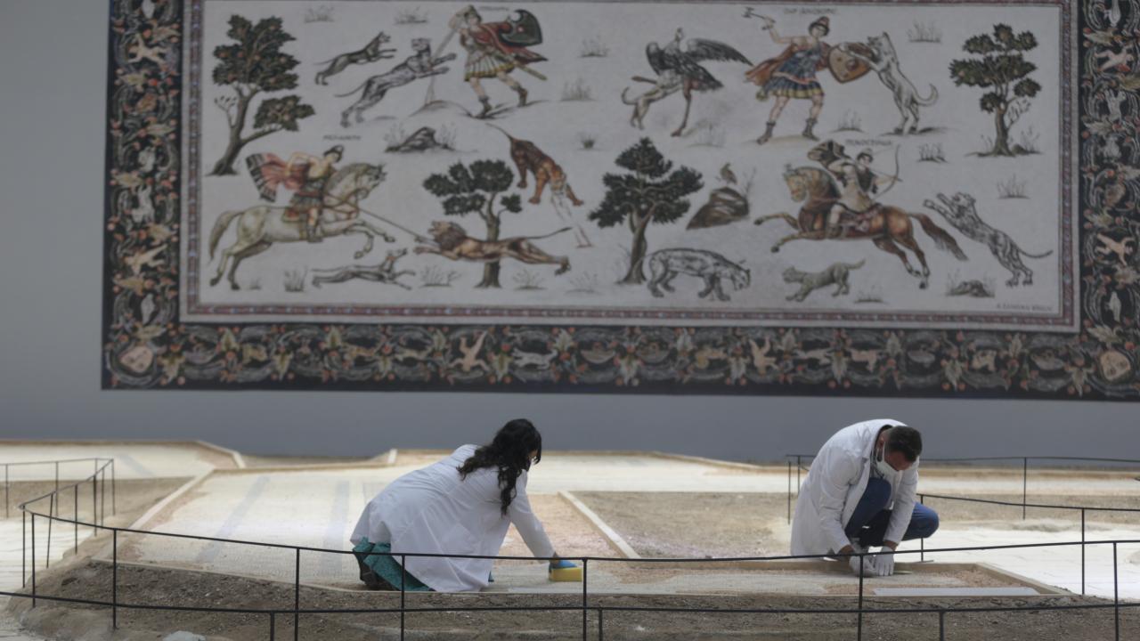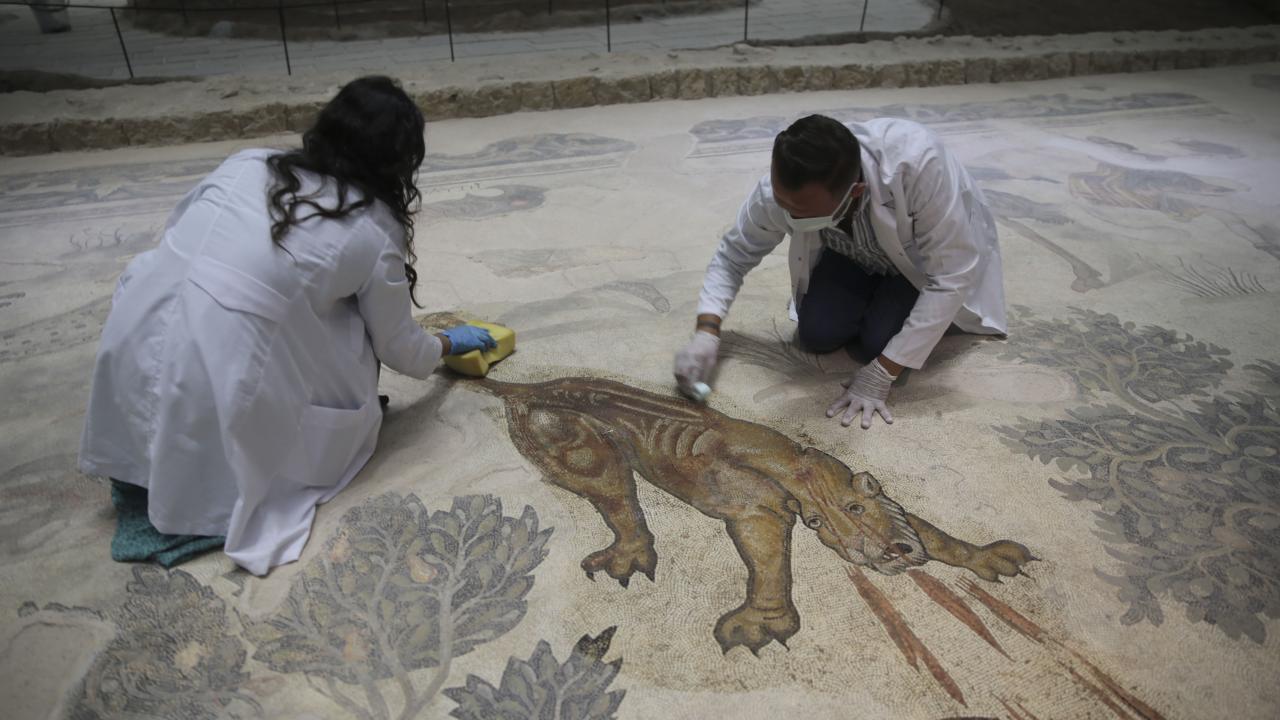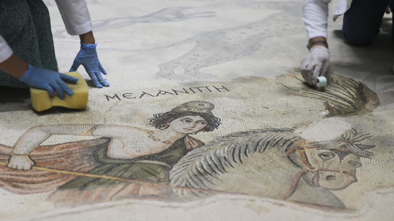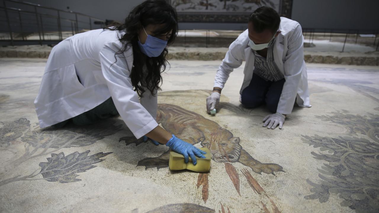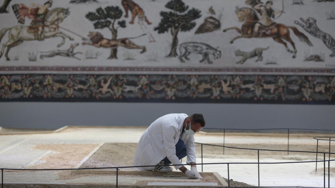 "Burada Roma dönemine tarihlenen bir saray yapısı var ve içerisinde de çeşitli mozaikler resmedilmiş. Özellikle bu mozaiklerin üzerindeki mitolojiler, betimlemeler çok önemli. Bunlardan en önemlisi de amazon kadınlarının resmedilmiş olduğu mozaikler. Mozaik müzemiz sürekli restoratör arkadaşlarımız tarafından kontrol ediliyor, bozulmalar, kirlenmeler, tozlanmalar hepsi müdahalelerle temizleniyor. Özellikle mozaikler üzerinde çok titizlikle çalışmamız gerekiyor, arkadaşlarımız süngerler ve yumuşak uçlu fırçalarla mozaik üzerindeki toz tabakasını suyla alıyorlar. Tabi suyun mozaiklerin altına işlememesi çok önemli, bu noktada yine suyu süngerle emerek temizlik çalışmalarını gerçekleştiriyorlar. Bu kontroller restoratörlerimiz tarafından rutin olarak gerçekleştiriliyor."