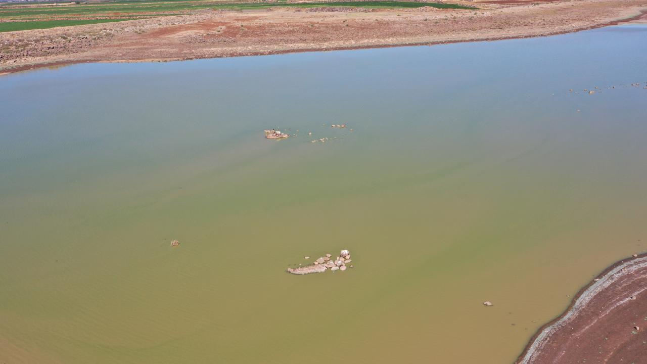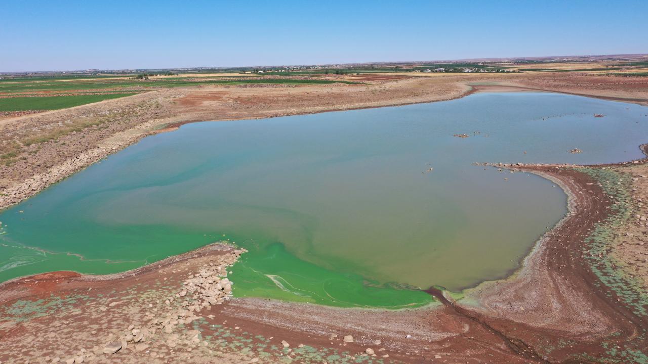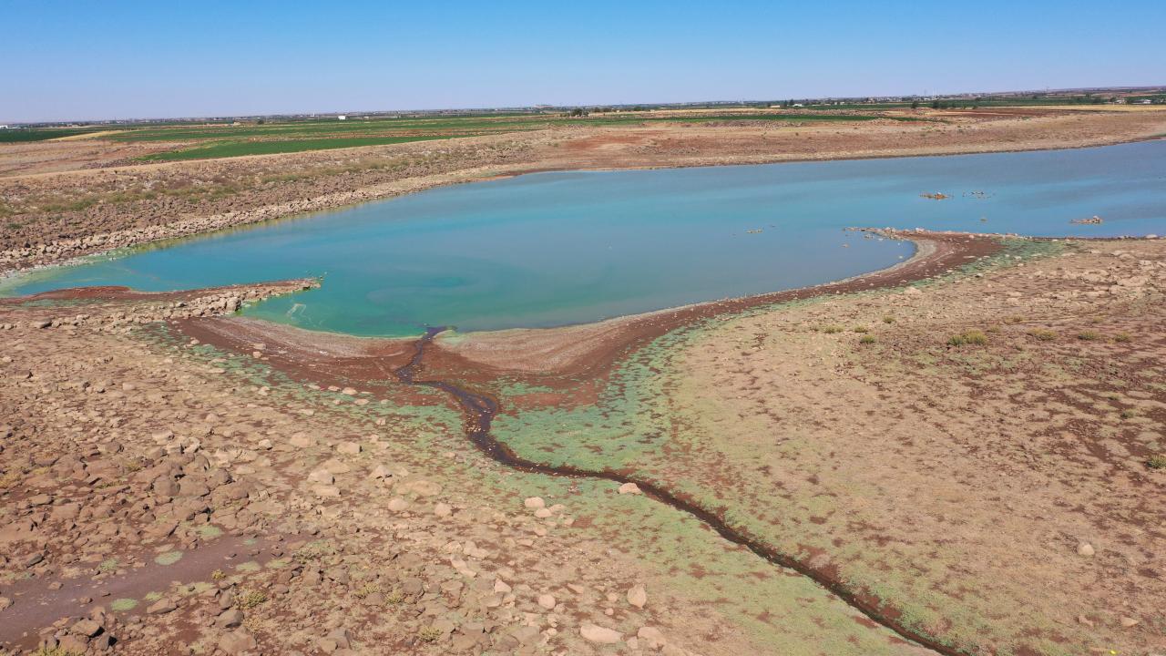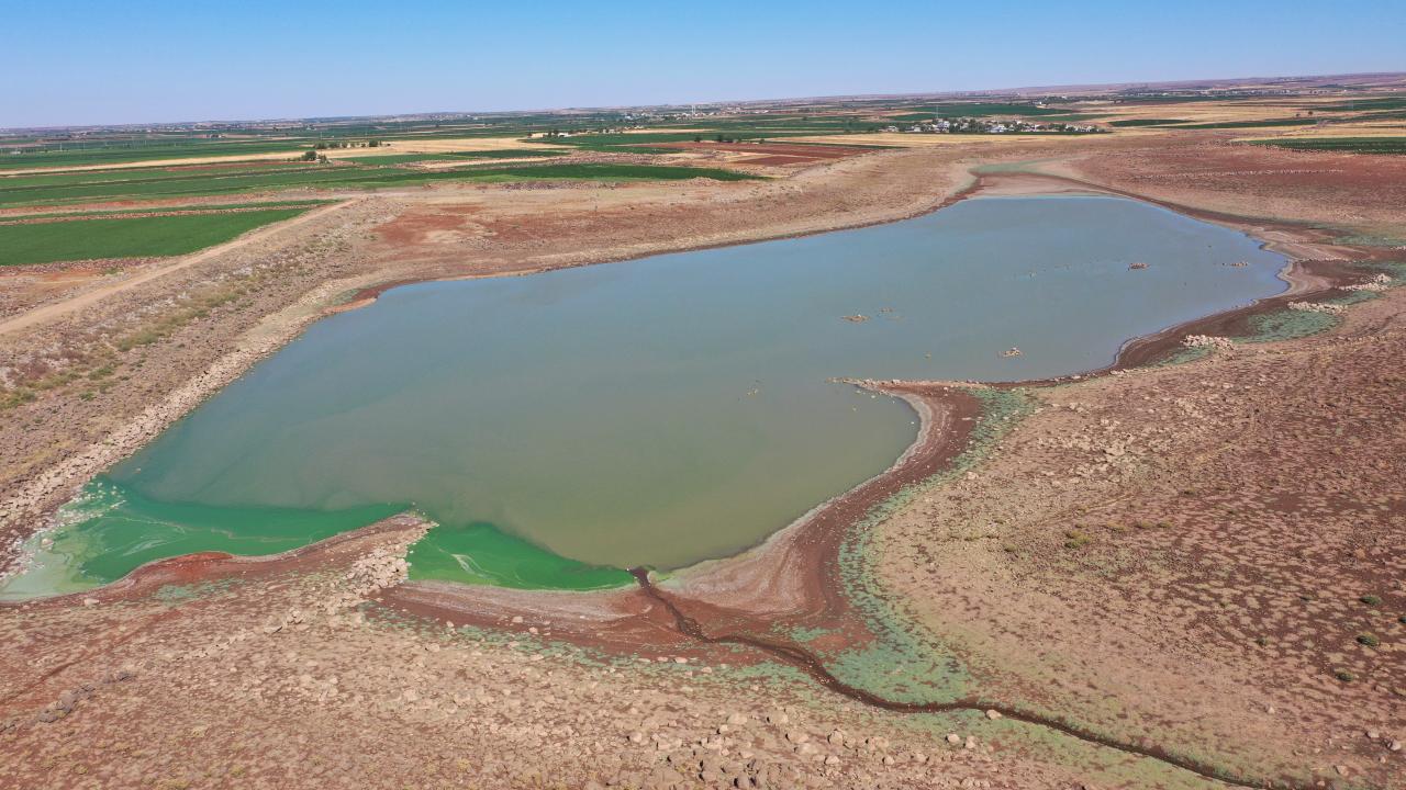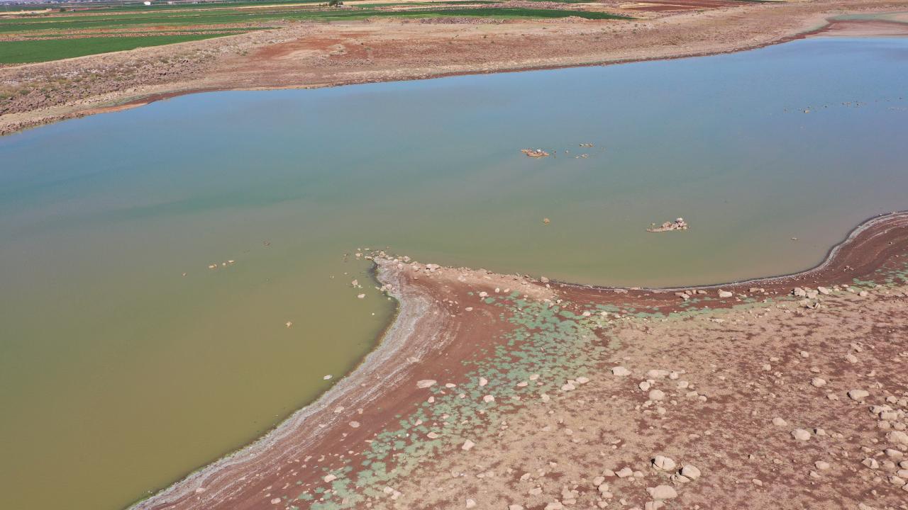 Şanlıurfa'nın Viranşehir ilçesinde 49 yıldır tarım arazilerini sulayan Sulutepe Göleti, kuraklık ve sıcaklık nedeniyle kuruma tehlikesiyle karşı karşıya kaldı. Neredeyse kuruma noktasına gelen göletteki çekilme ve tabanda oluşan çatlaklar, dronla görüntülendi.