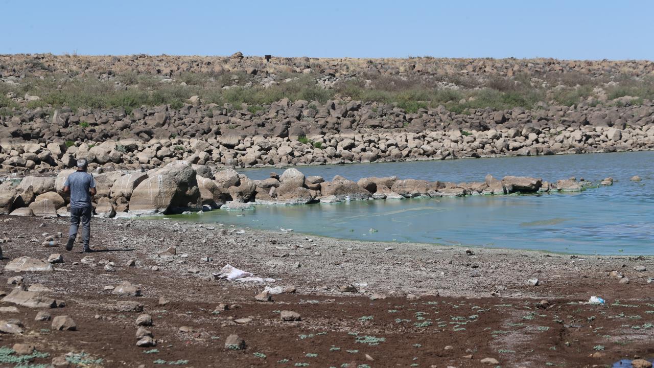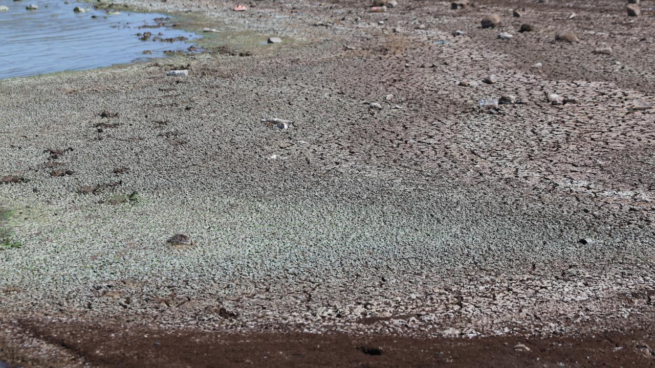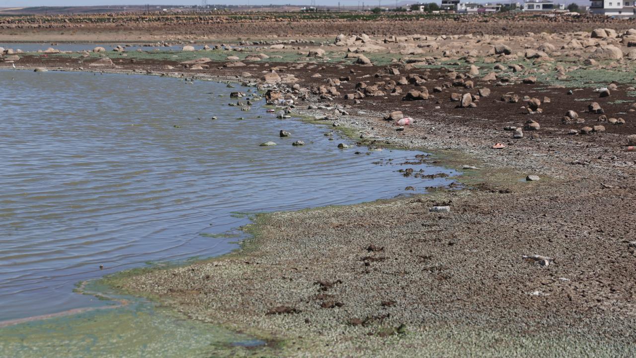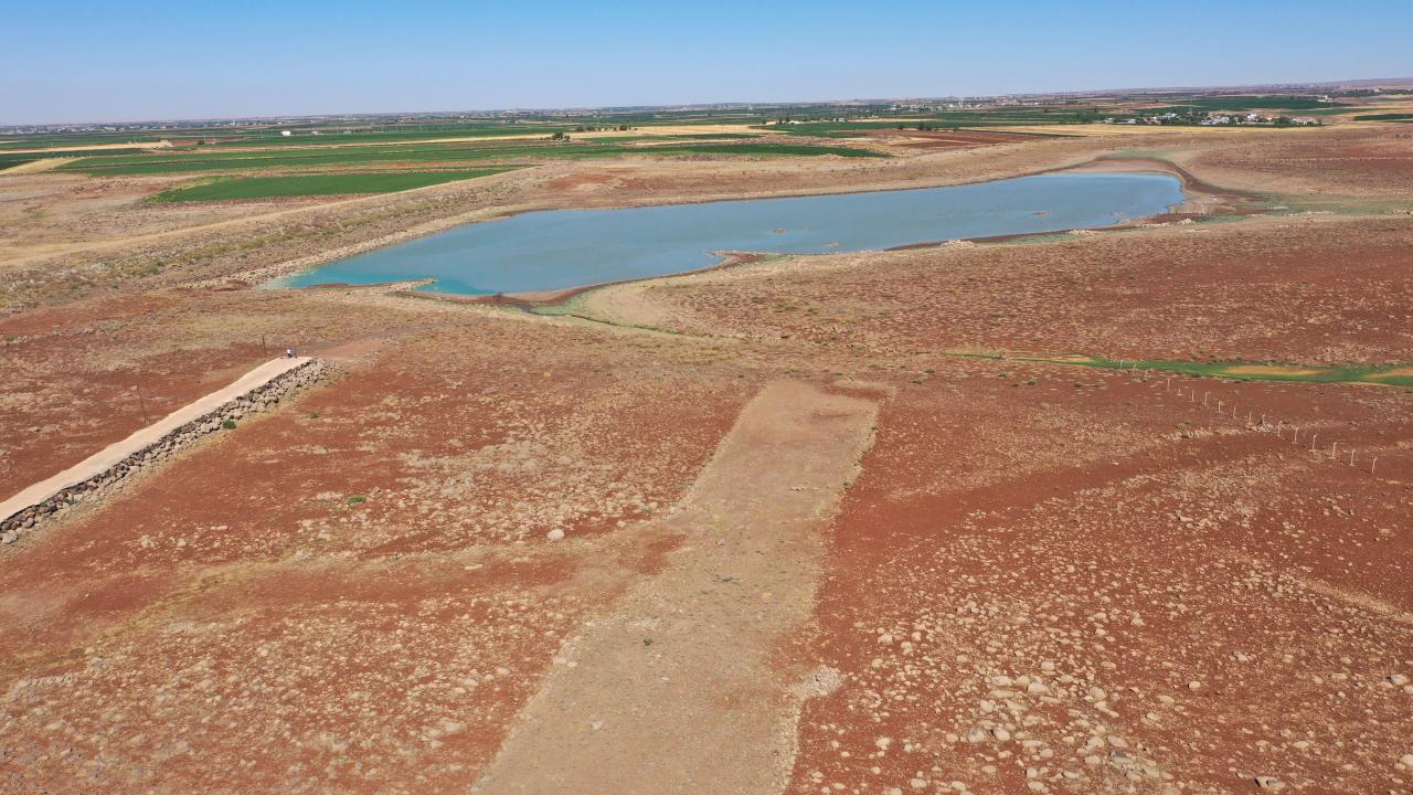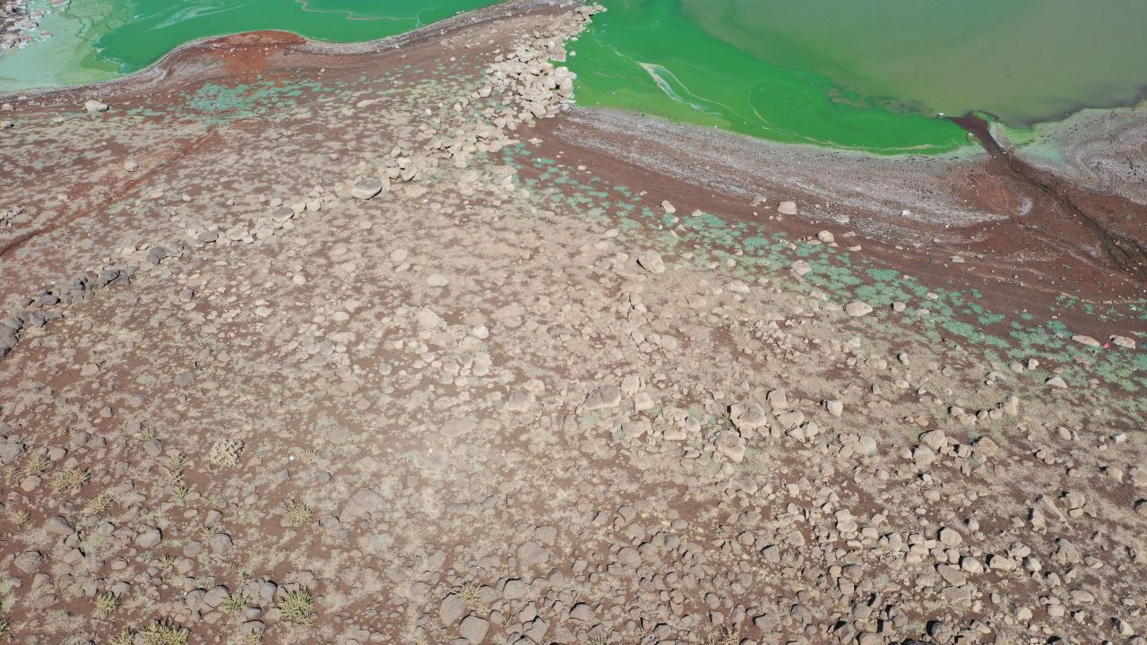 Şanlıurfa'nın Viranşehir ilçesinde 49 yıldır tarım arazilerini sulayan Sulutepe Göleti, kuraklık ve sıcaklık nedeniyle kuruma tehlikesiyle karşı karşıya kaldı. Neredeyse kuruma noktasına gelen göletteki çekilme ve tabanda oluşan çatlaklar, dronla görüntülendi.