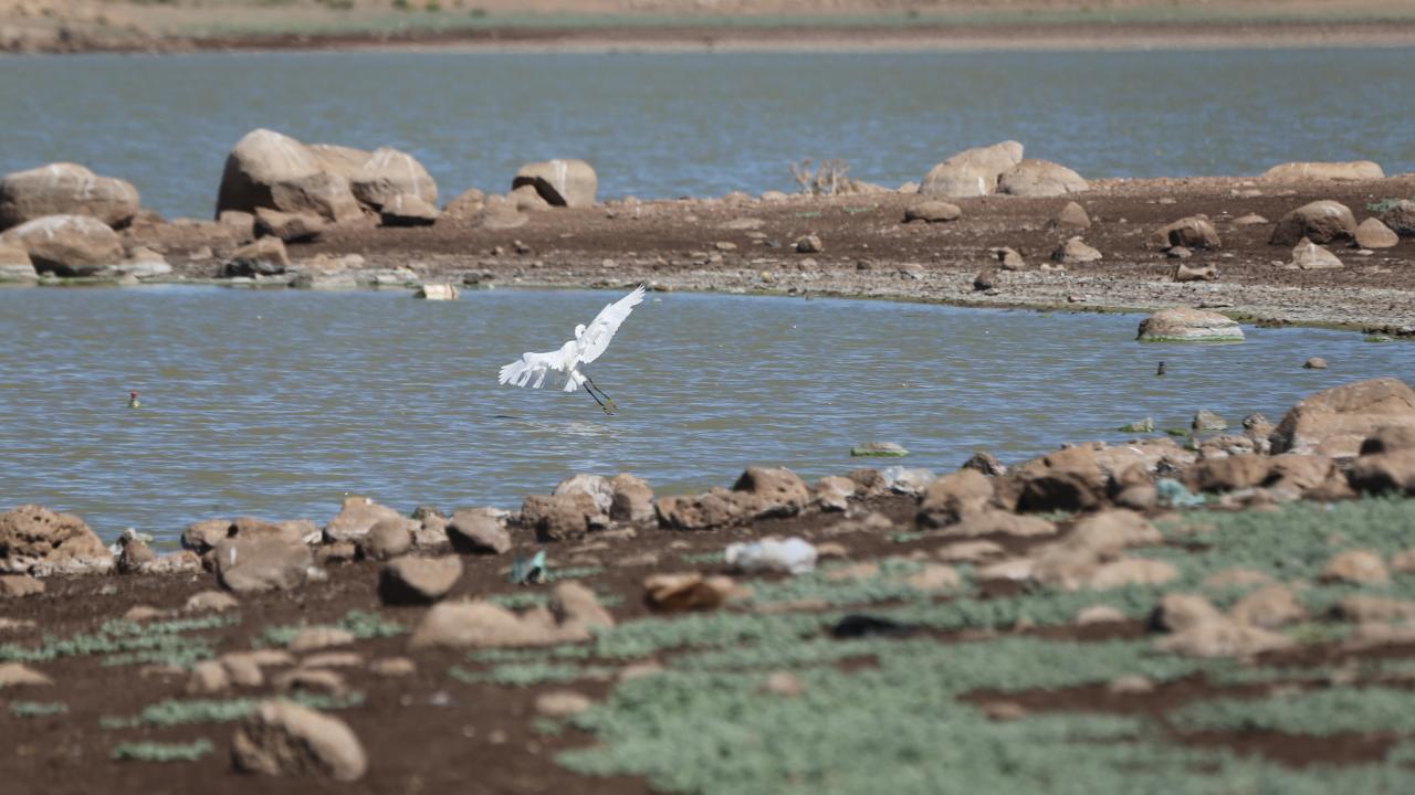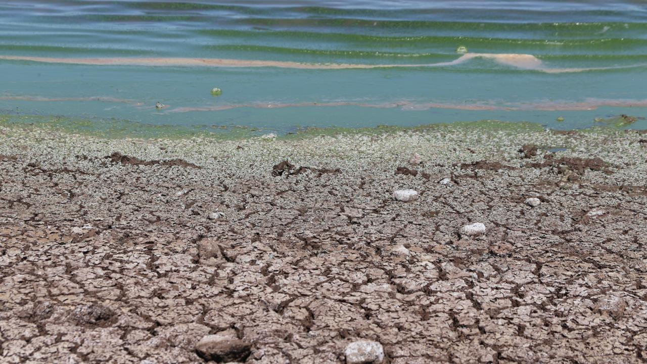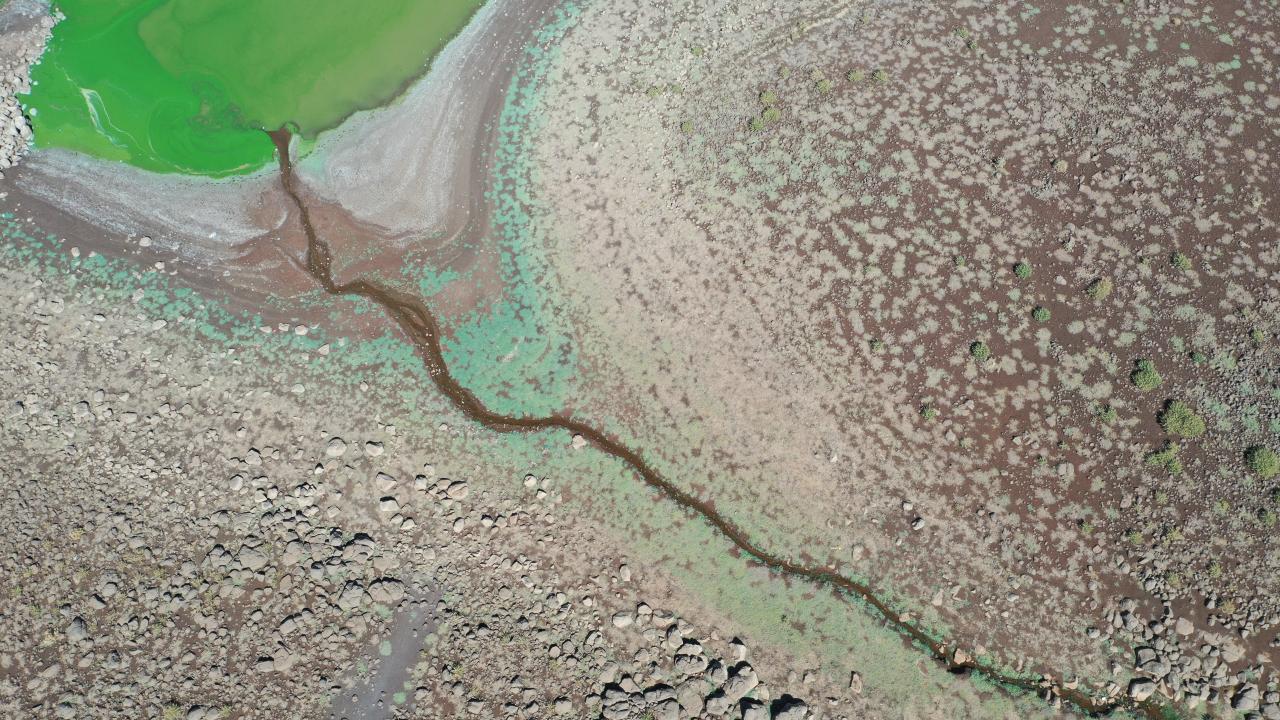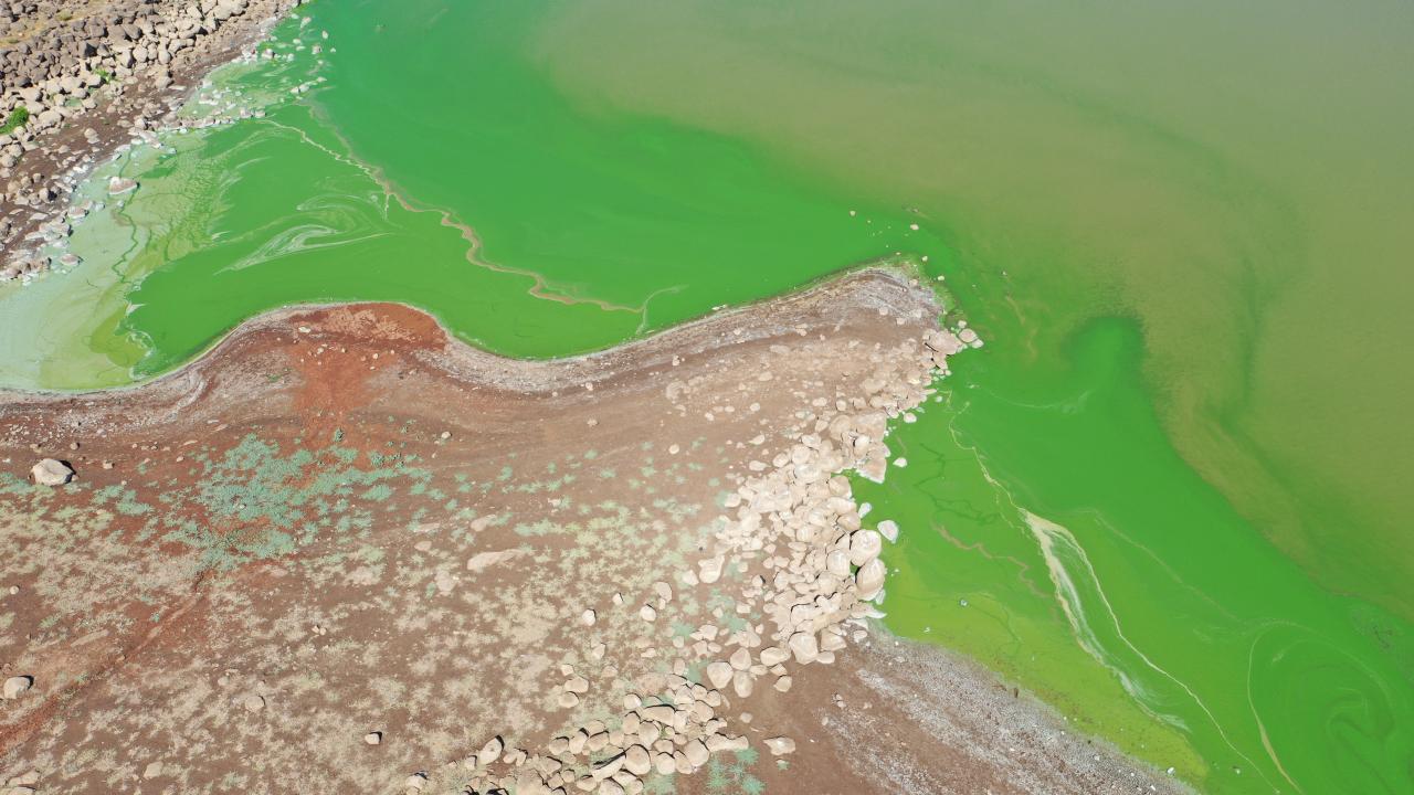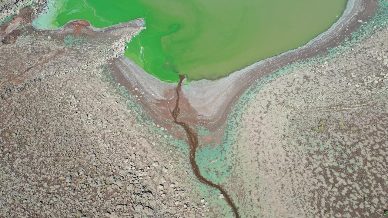 Şanlıurfa'nın Viranşehir ilçesinde 49 yıldır tarım arazilerini sulayan Sulutepe Göleti, kuraklık ve sıcaklık nedeniyle kuruma tehlikesiyle karşı karşıya kaldı. Neredeyse kuruma noktasına gelen göletteki çekilme ve tabanda oluşan çatlaklar, dronla görüntülendi.