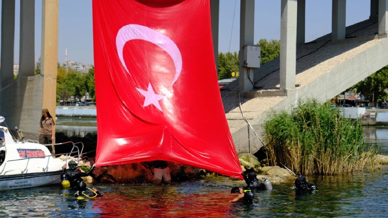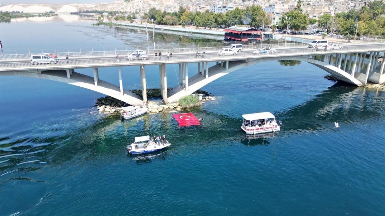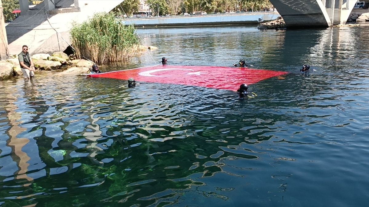 İlçede 30 Ağustos Zafer Bayramı`nın 102. yıl dönümü için düzenlenen etkinlikler kapsamında dalgıçlar, Fırat Nehri`nde açtıkları Türk bayrağını Birecik Köprüsü`ne astı.