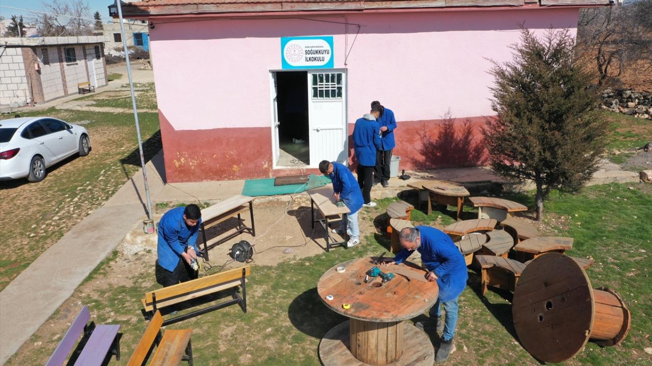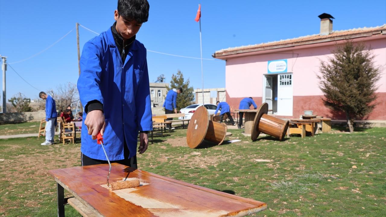 Öğrenciler ayrıca eski kablo makaralarından oturak yaparak hem atık ve geri dönüştürülebilir malzemeleri değerlendiriyor hem de yeni sosyal alanlar oluşturuyor.